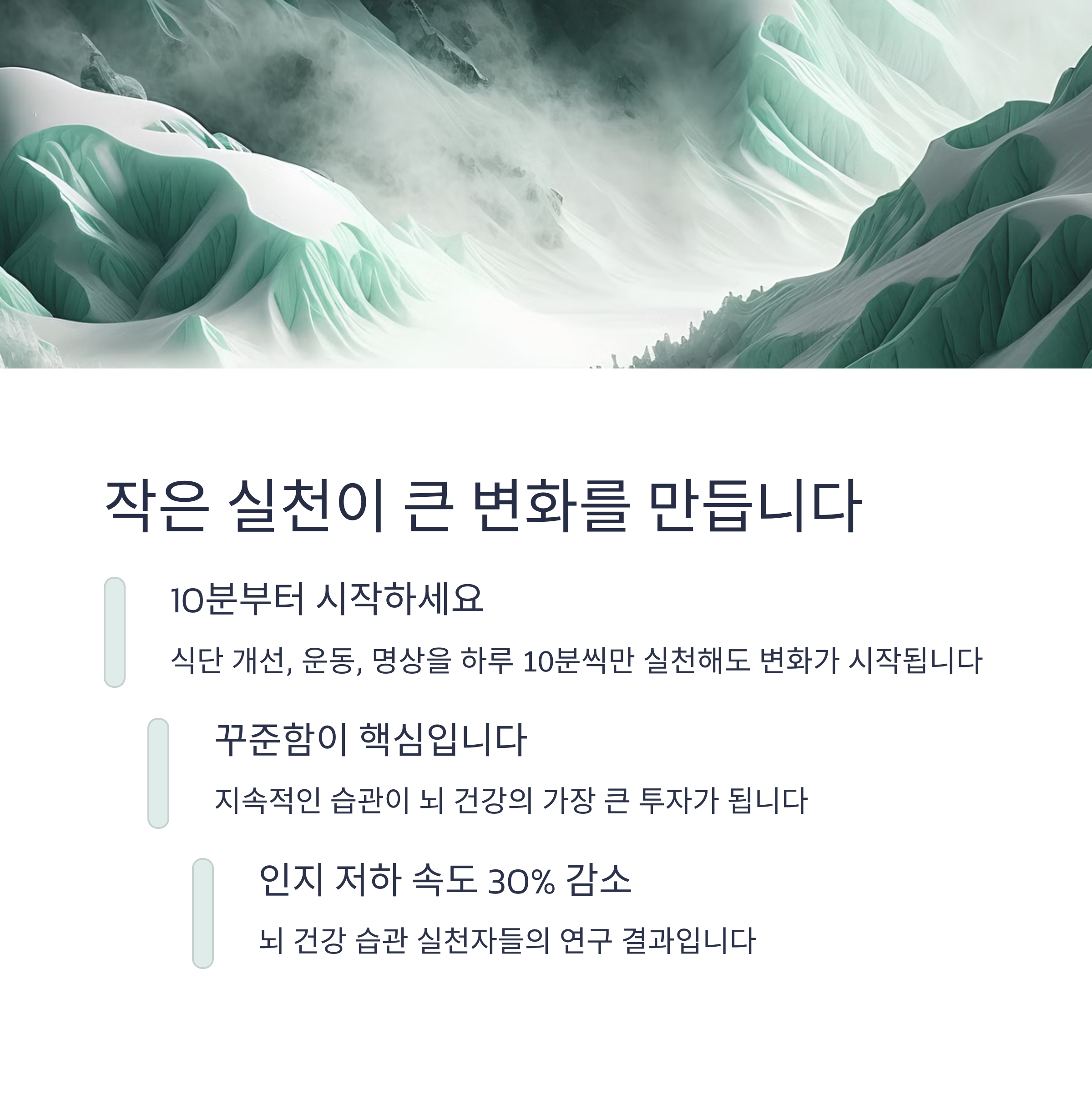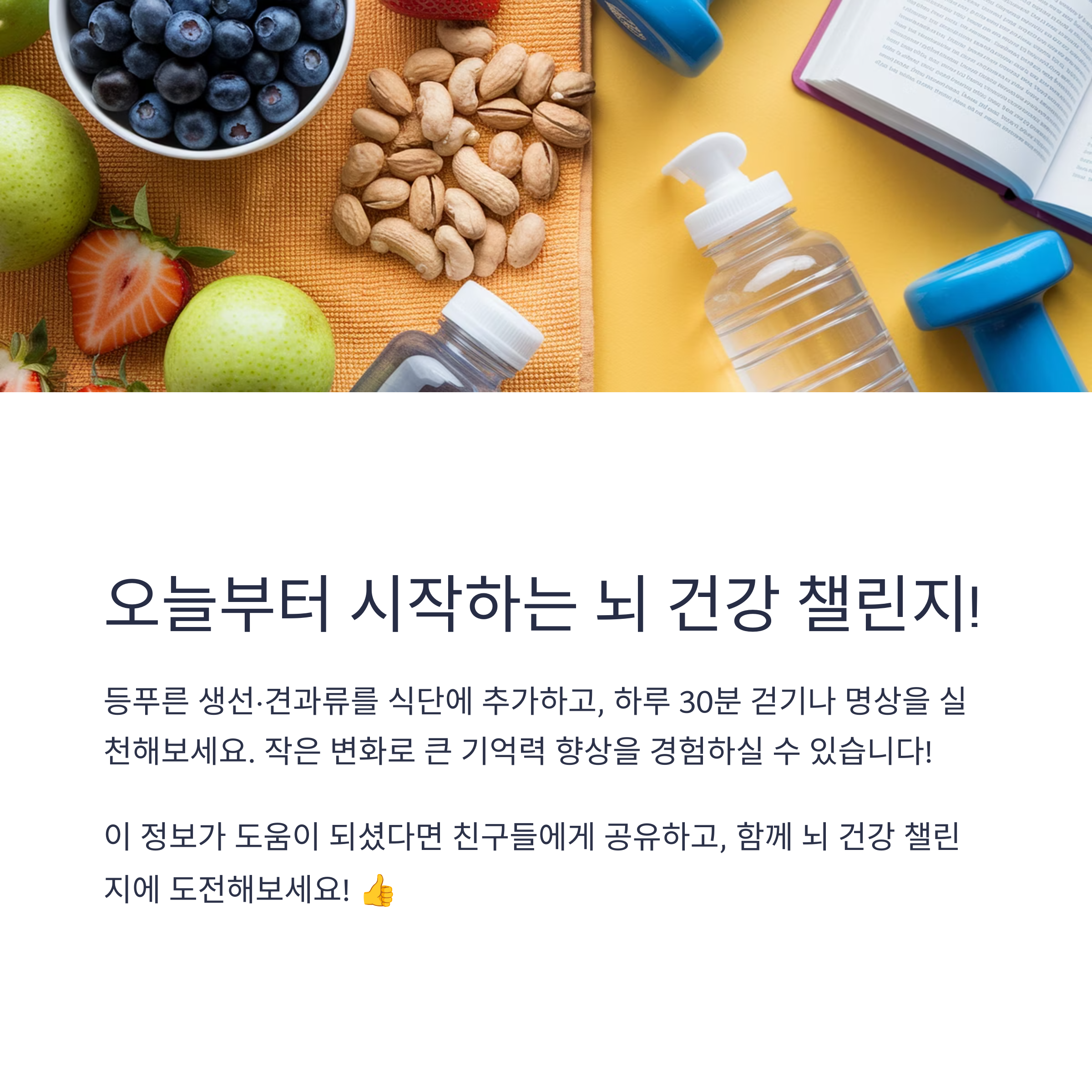뇌 건강은 하루아침에 달라지지 않지만 작은 실천들이 모여 큰 변화를 만듭니다. 식단에서는 혈액순환과 항산화에 좋은 식품을 선택하고, 운동은 뇌 활성화를 돕는 유산소 위주로 꾸준히 실천하는 것이 좋습니다. 더 나은 집중력과 기억력을 위해 오늘부터라도 건강한 식사와 운동 습관을 실천해보는 건 어떨까요?