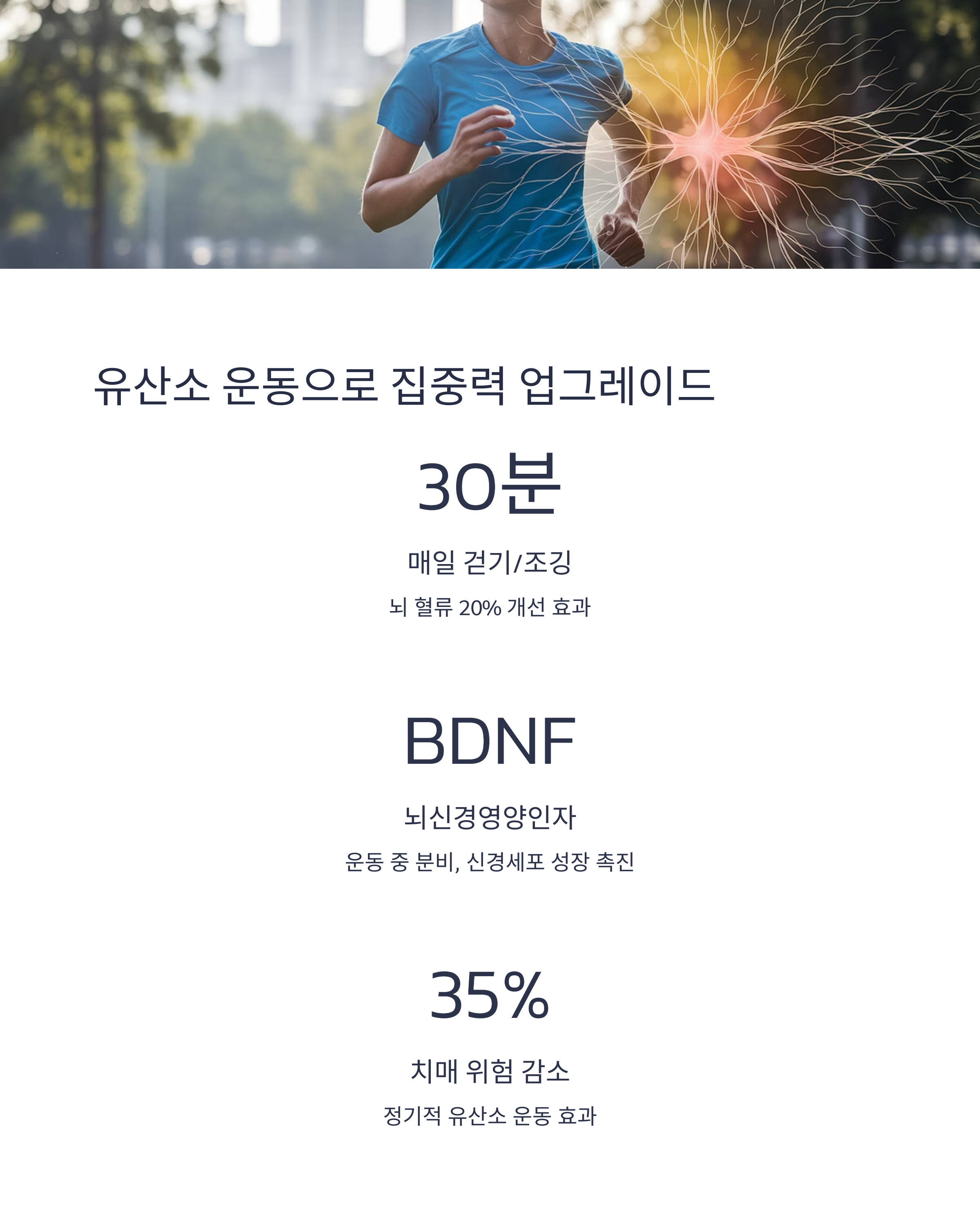 기억력 향상에는 식단뿐 아니라 운동도 핵심입니다. 특히 유산소 운동은 뇌로 가는 혈류를 증가시켜 산소와 영양소 공급을 활발히 하며 인지 기능에 긍정적인 영향을 줍니다. 하루 30분 이상 걷기, 조깅, 자전거 타기 같은 간단한 운동을 꾸준히 실천하면 기억력 유지에 큰 도움이 됩니다. 또한 명상과 심호흡은 스트레스 완화와 집중력 향상에 효과적인 습관이니 함께 병행해보세요.