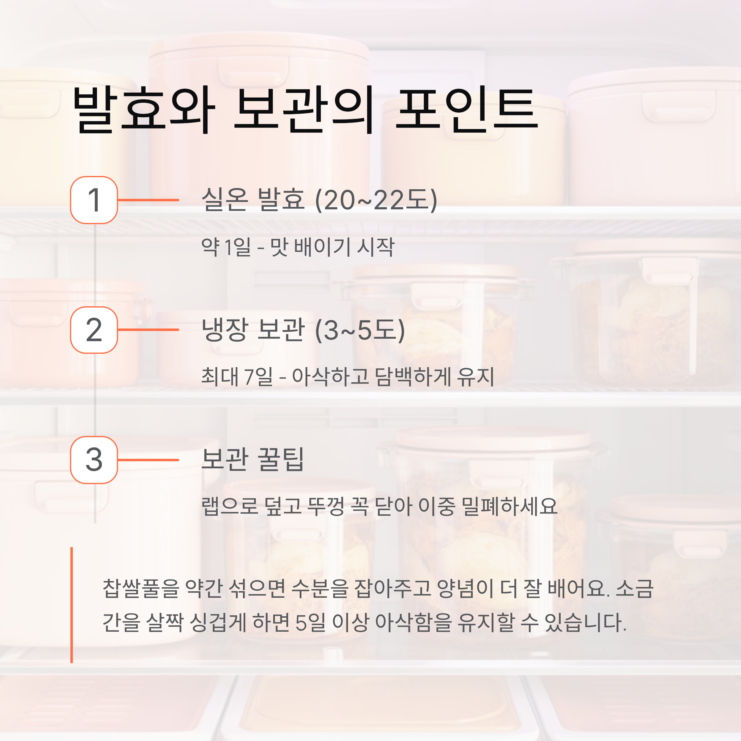 | 냉장 (3~5도) | 최대 7일 | 아삭하고 담백 |