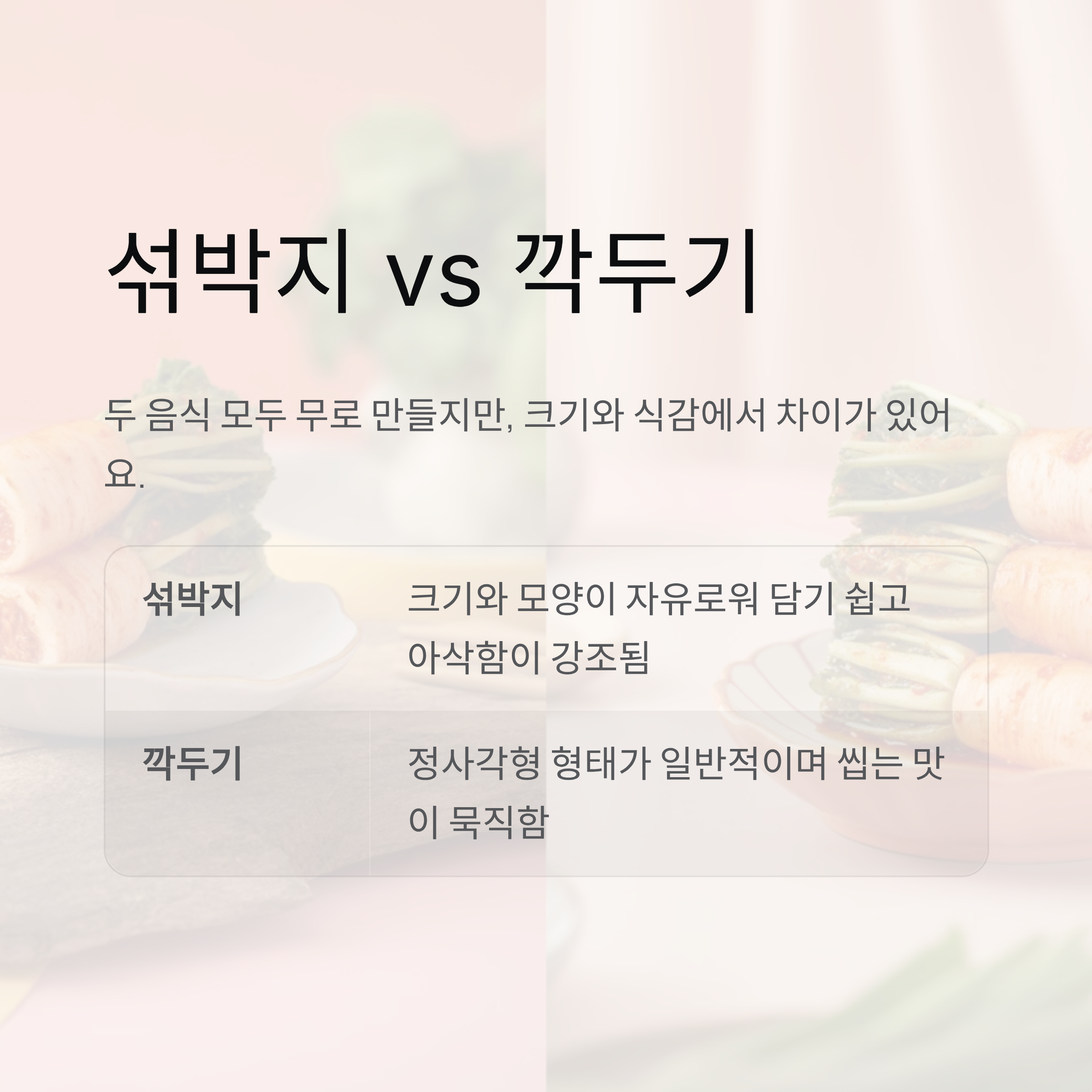 두 음식은 무를 써서 만든다는 점에서 비슷하지만, 깍두기는 정육면체 형태가 일반적이고 섞박지는 조금 더 자유로운 모양을 말합니다. 양념 구성은 거의 비슷하지만 크기 차이에서 오는 식감이 다릅니다. 아래 표에서 간단하게 비교해 보세요.