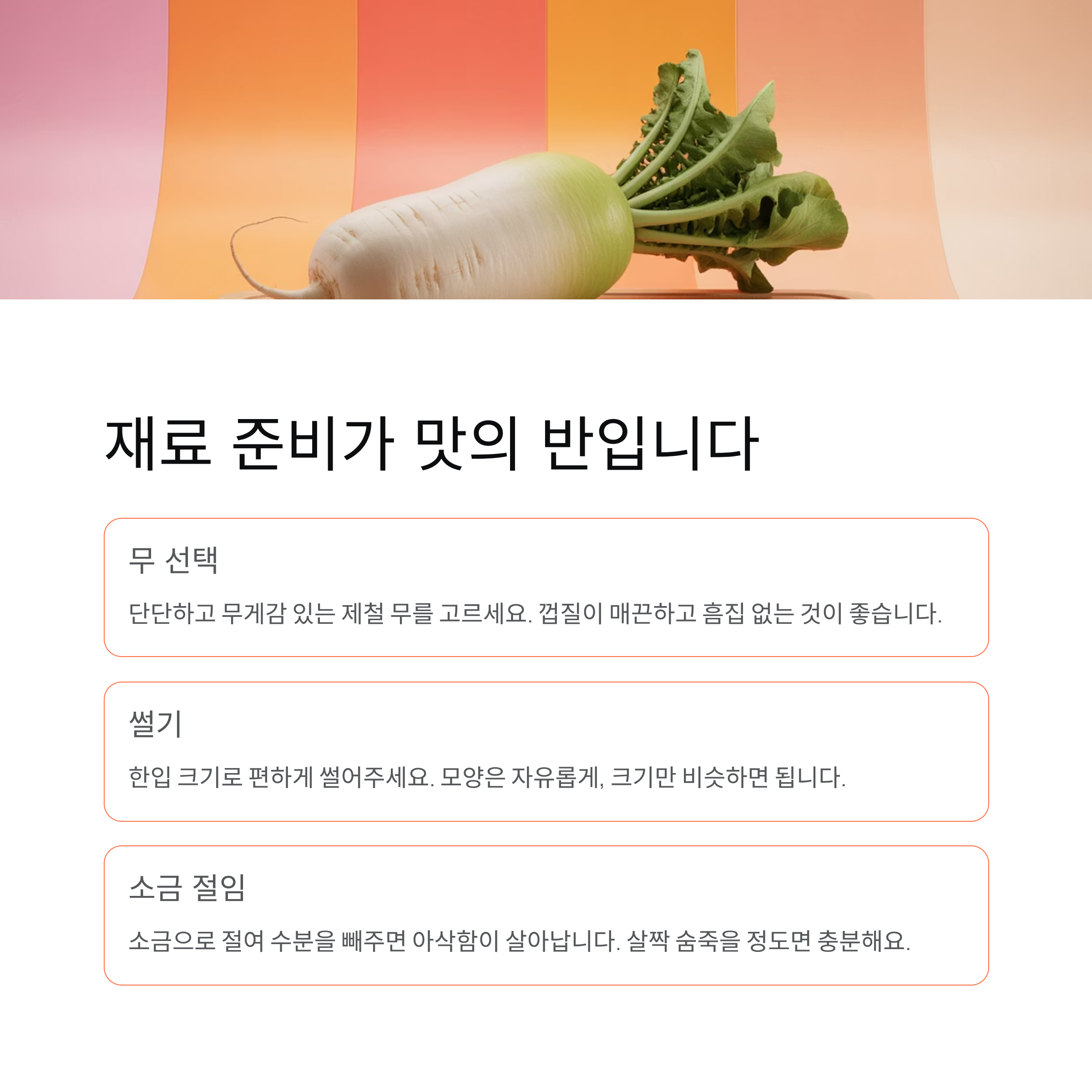 무는 단단하고 무게감 있는 것으로 고르면 좋습니다. 흙 묻은 무를 다듬어 한입 크기로 썰어주고, 소금으로 절여 수분을 적당히 빼주는 과정이 맛의 균형을 잡아줍니다. 소금 절임 시간은 무의 상태에 따라 달라지지만 크게 오래 걸리지는 않아요. 살짝 숨이 죽을 정도면 충분합니다.