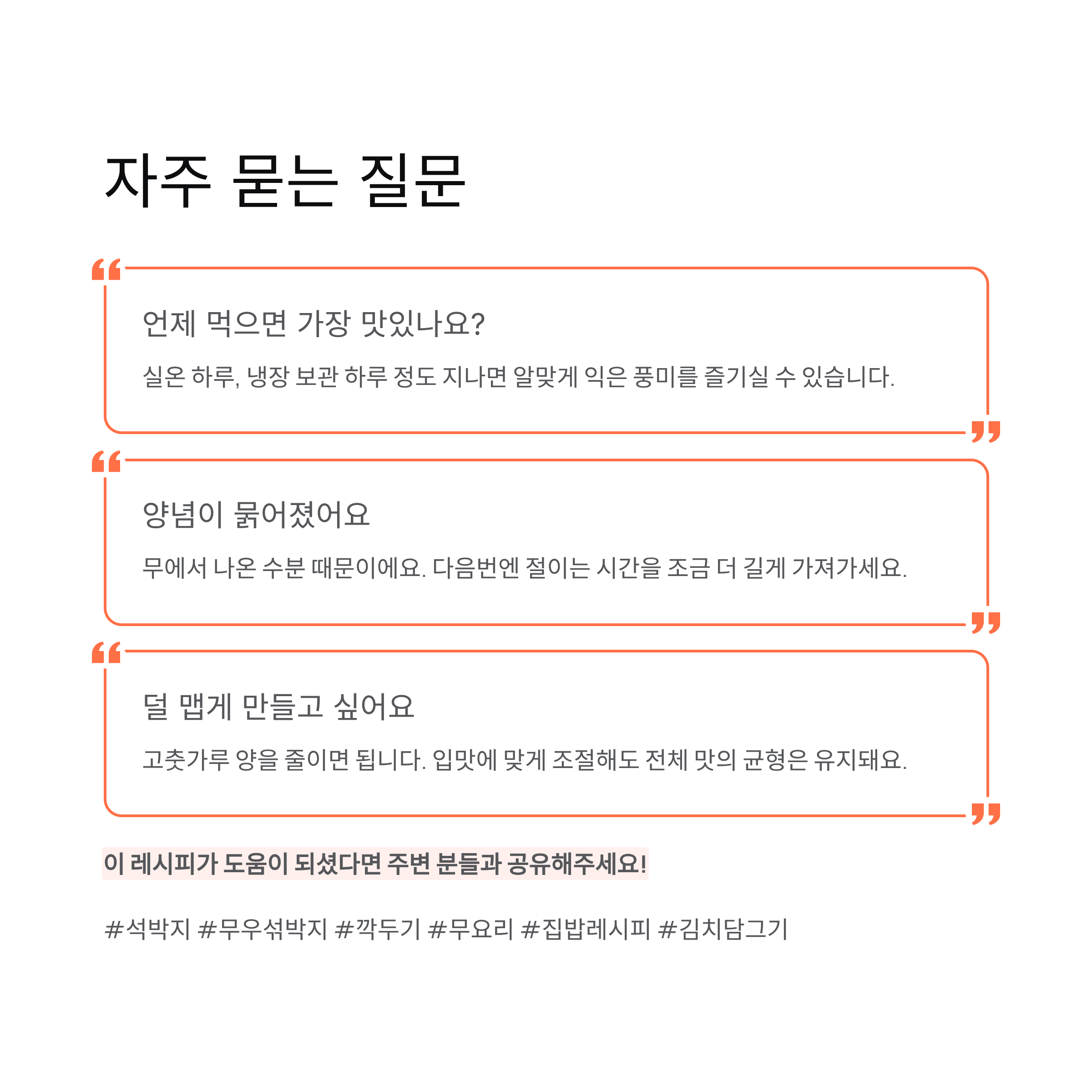숙성이 진행될수록 무 특유의 단맛이 배어나오고, 양념과 만나 깊은 조화를 이루기 때문입니다. 무가 지닌 고유의 산뜻함은 그대로 두고 양념의 풍미만 더해지는 느낌이라 먹을수록 더 만족도가 높아집니다.
