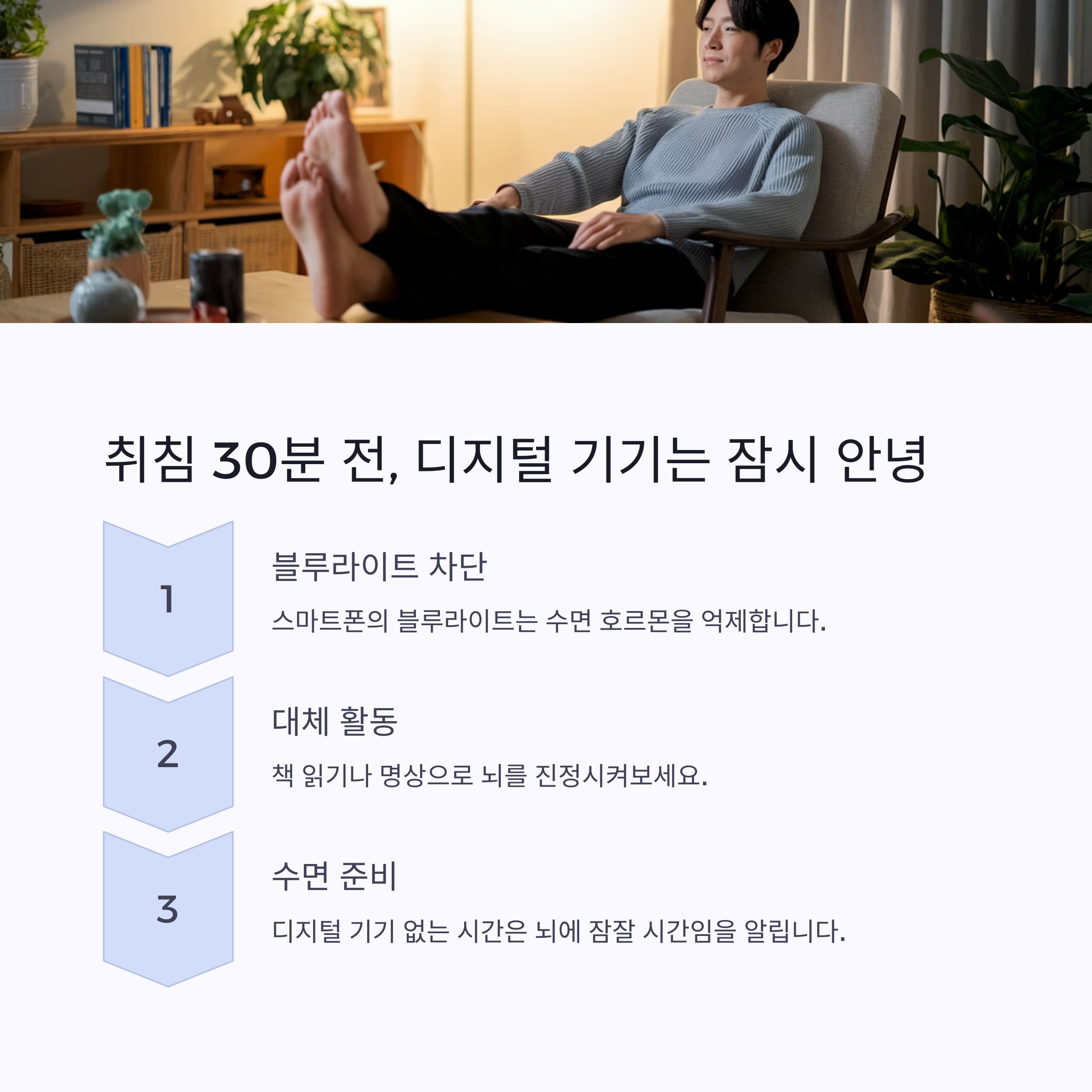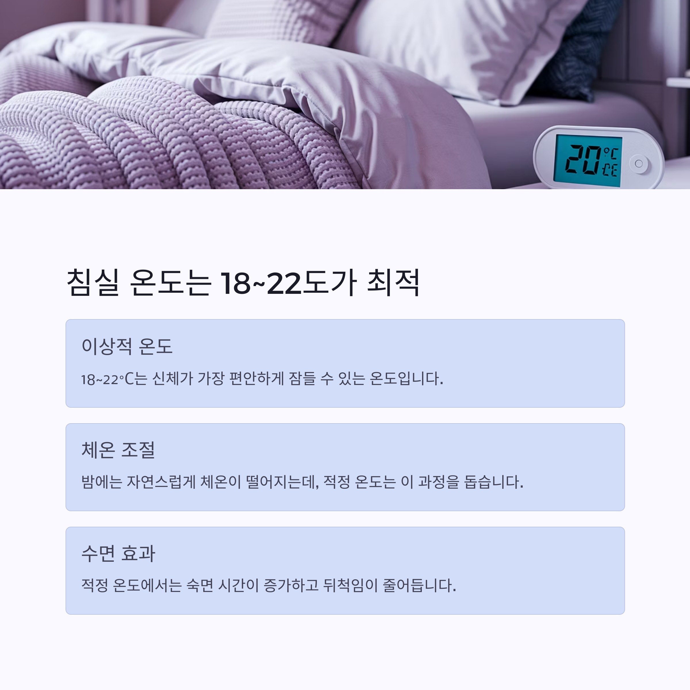 | 18~22도 유지, 사계절 이불 추천 | 은은한 간접등, 수면등 활용 | 취침 전 스마트폰 사용 자제 |