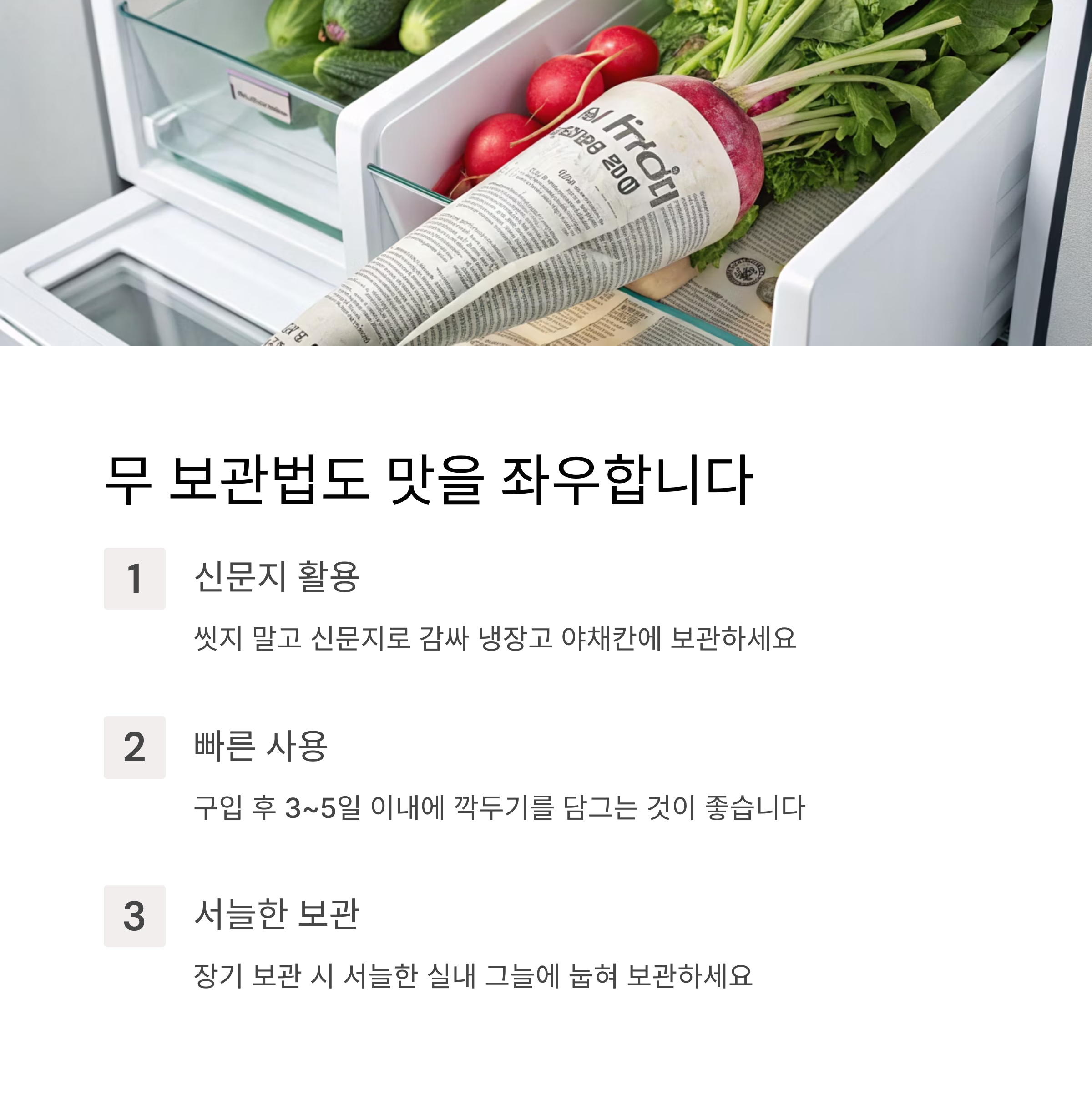 - 무를 씻지 말고 신문지로 감싸 냉장 보관