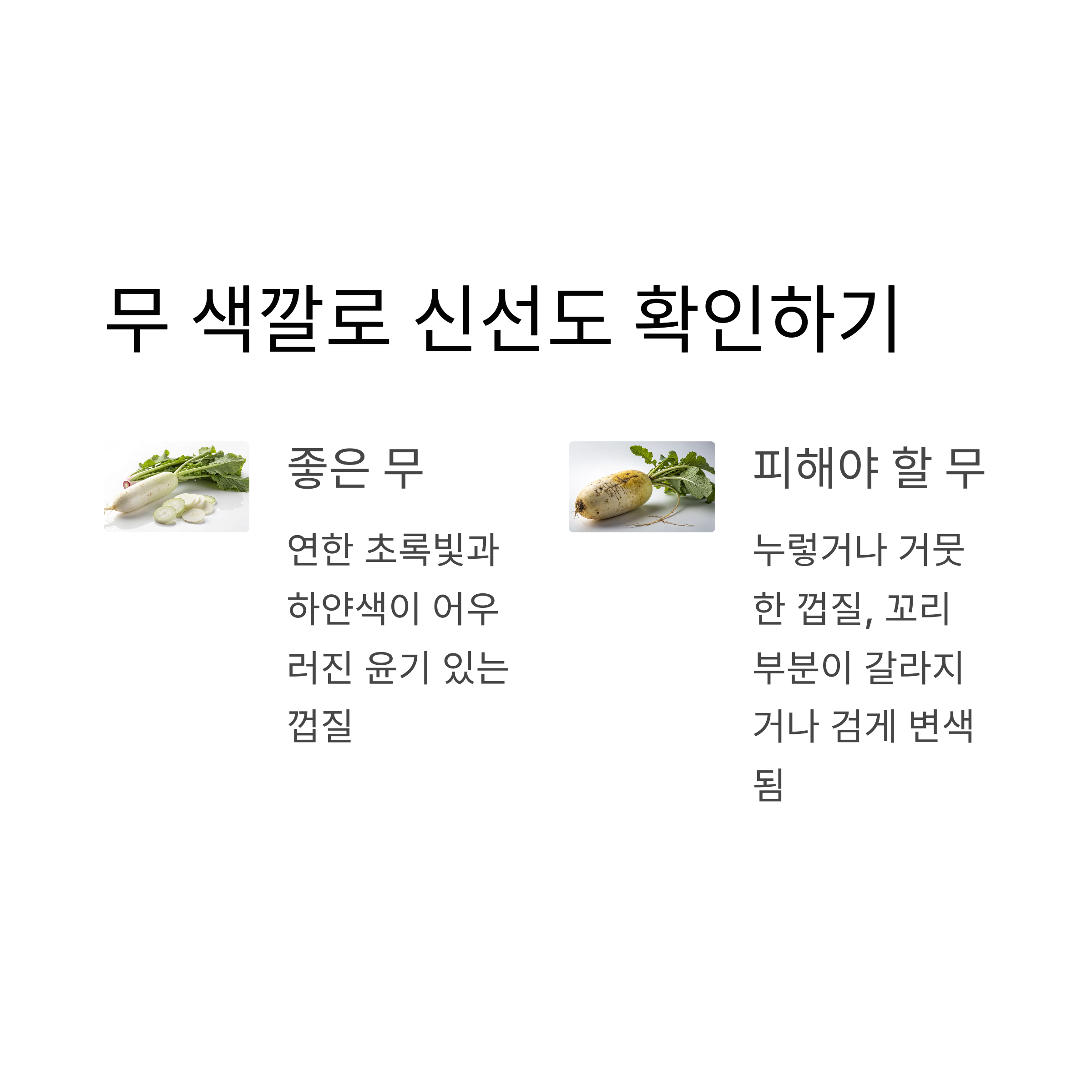 | 무 밑동(꼬리) | 둥글고 단단, 물기 없이 뽀얀 느낌 | 갈라짐, 무름, 까맣게 변색됨 |