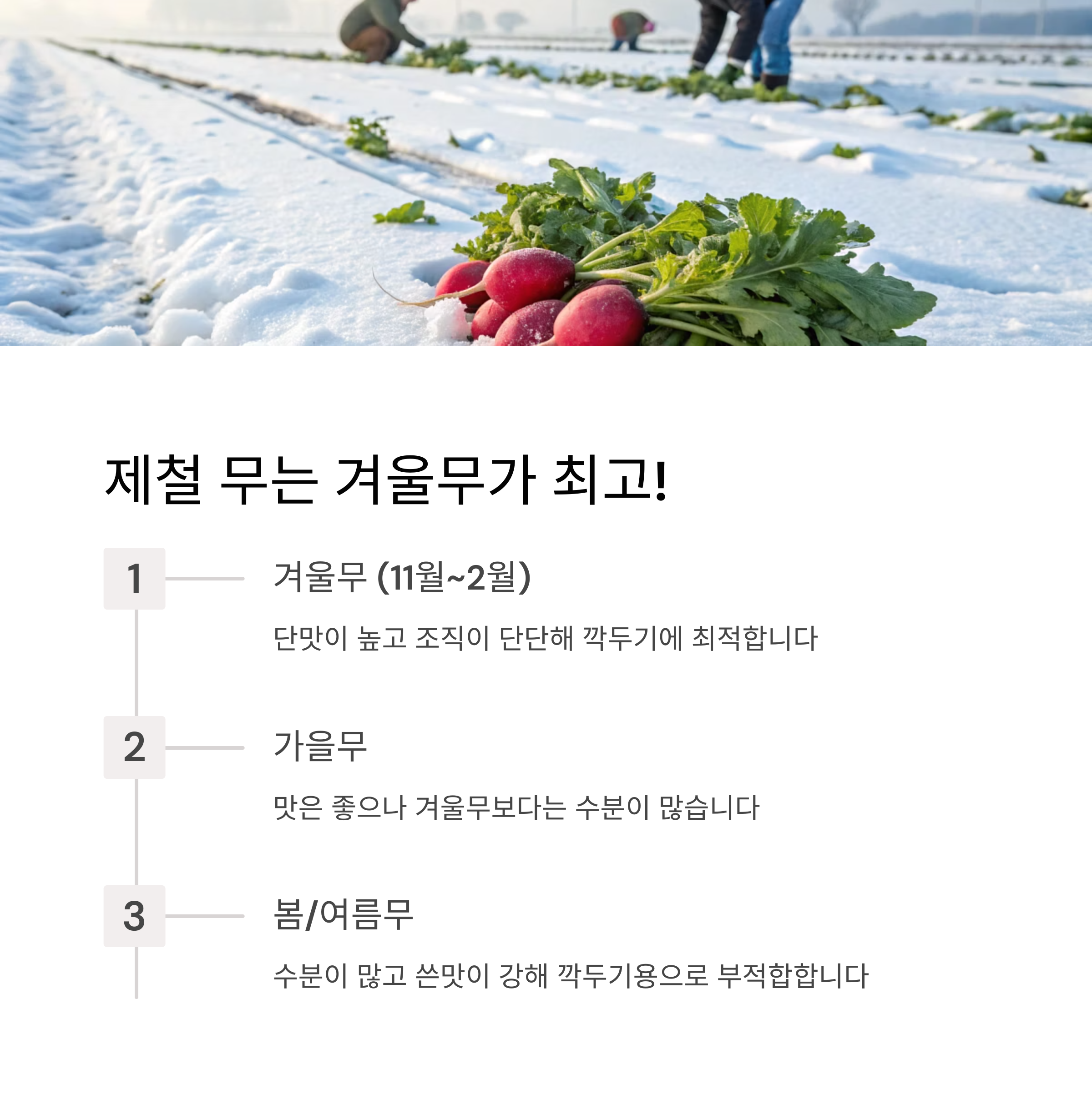 | 제철 여부 | 11~2월 겨울 무가 가장 단맛과 조직 우수함 |