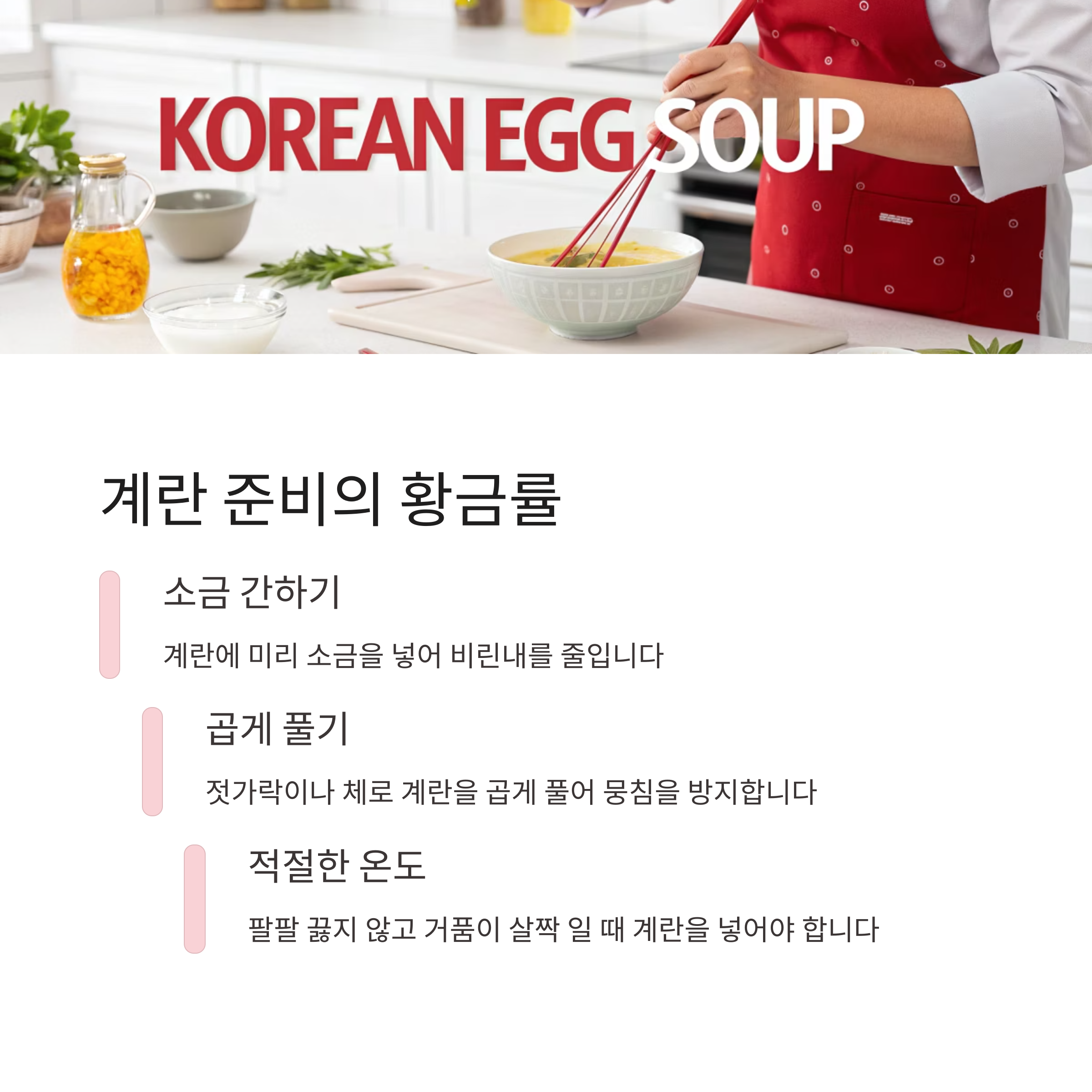 **"국물은 맑고 계란은 부드럽게"**가 계란국의 핵심입니다.