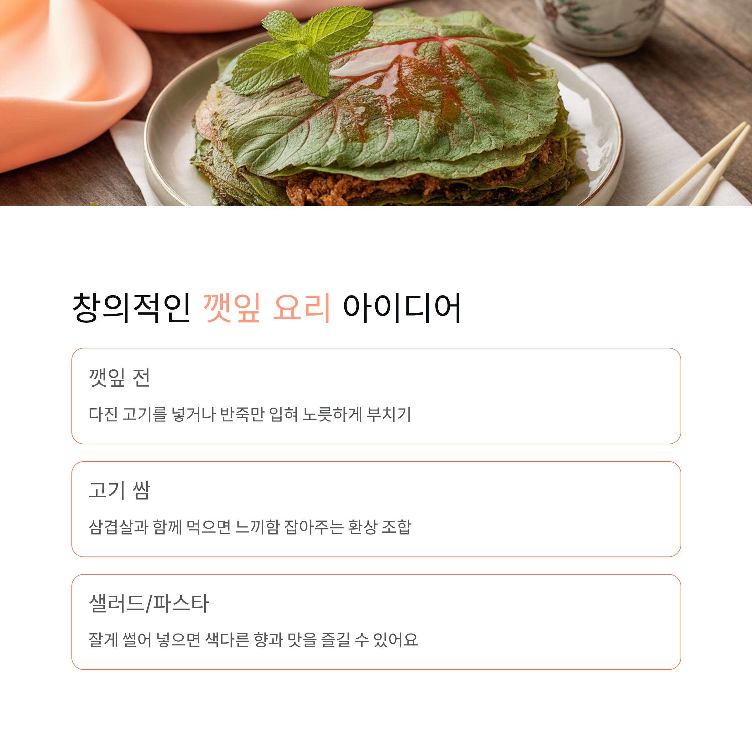 깻잎은 풍부한 효능을 지닌 건강식품일 뿐 아니라, 다양한 요리로 활용할 수 있는 식재료입니다.
