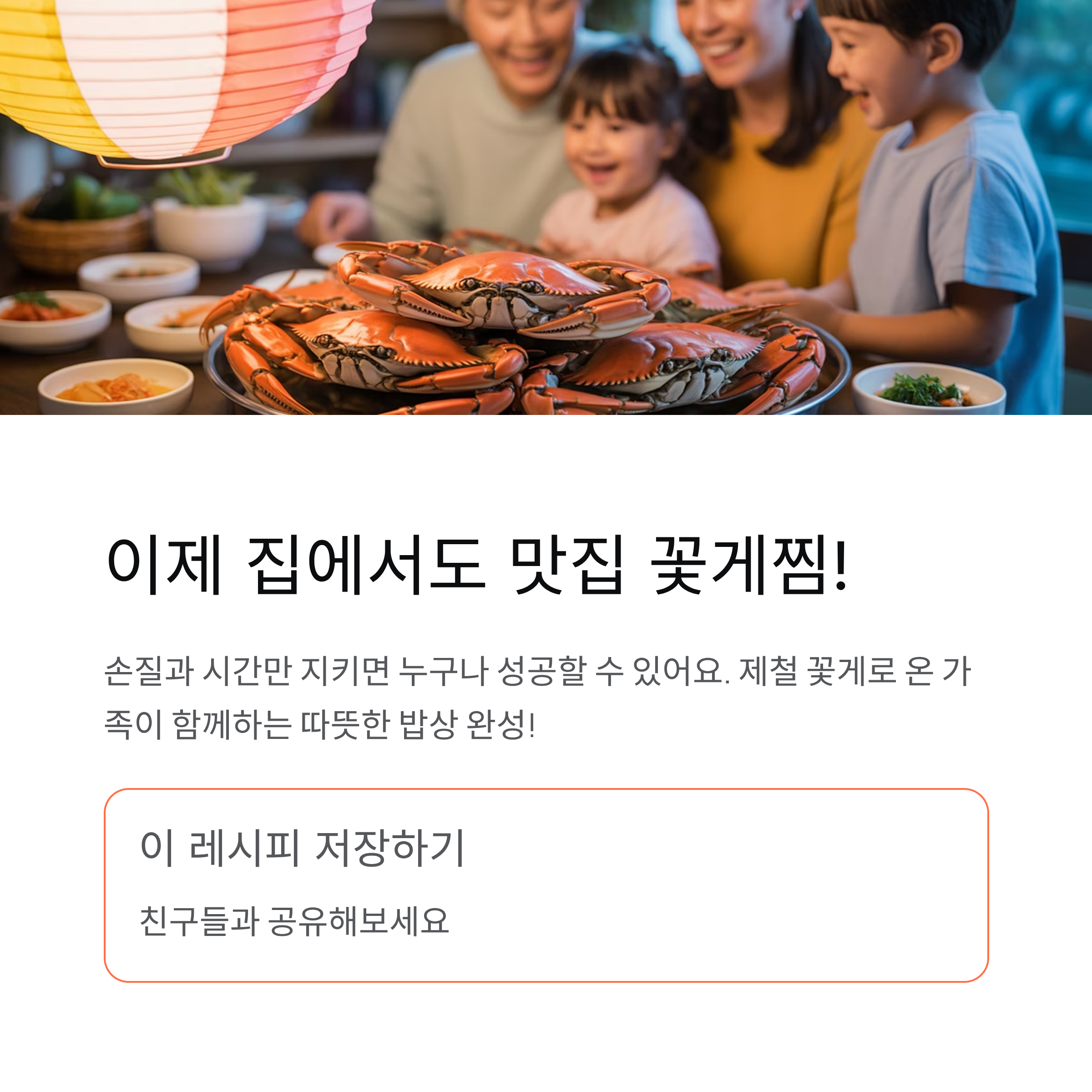 꽃게찜은 손질과 찌는 시간만 잘 지키면 누구나 집에서 성공할 수 있는 요리입니다. 비린내를 잡는 재료를 함께 넣어주면 훨씬 깔끔하고 풍성한 맛을 즐길 수 있지요. 제철 꽃게로 온 가족이 함께하는 따뜻한 밥상, 오늘 저녁에 한 번 도전해 보시는 건 어떨까요?