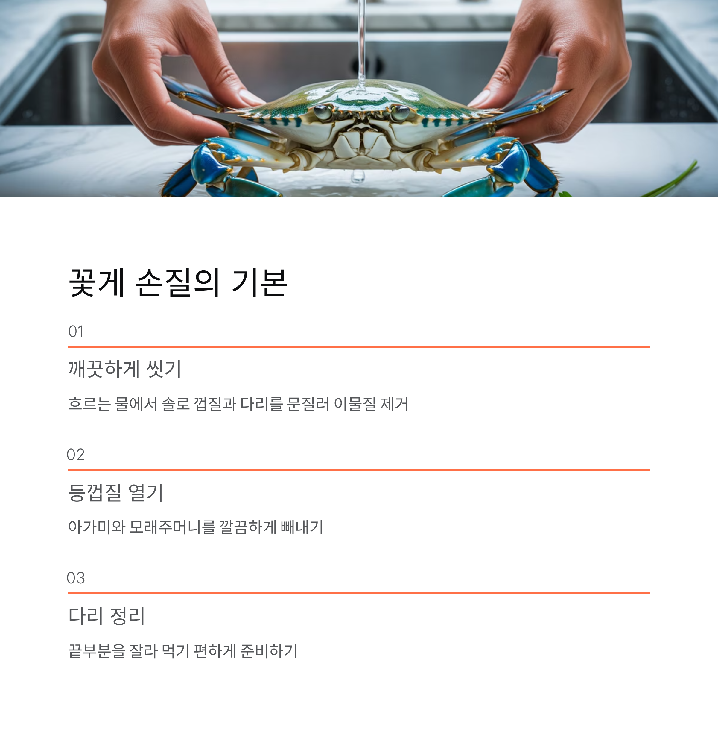 먼저 꽃게를 흐르는 물에 씻으면서 솔로 껍질과 다리를 문질러 이물질을 제거합니다. 이어서 등껍질을 열고 아가미와 모래주머니를 빼내세요. 다리 끝부분은 잘라주면 먹기 훨씬 편리합니다. 손질한 후에는 너무 오래 물에 담그지 말고 빠르게 헹궈주는 것이 핵심입니다.