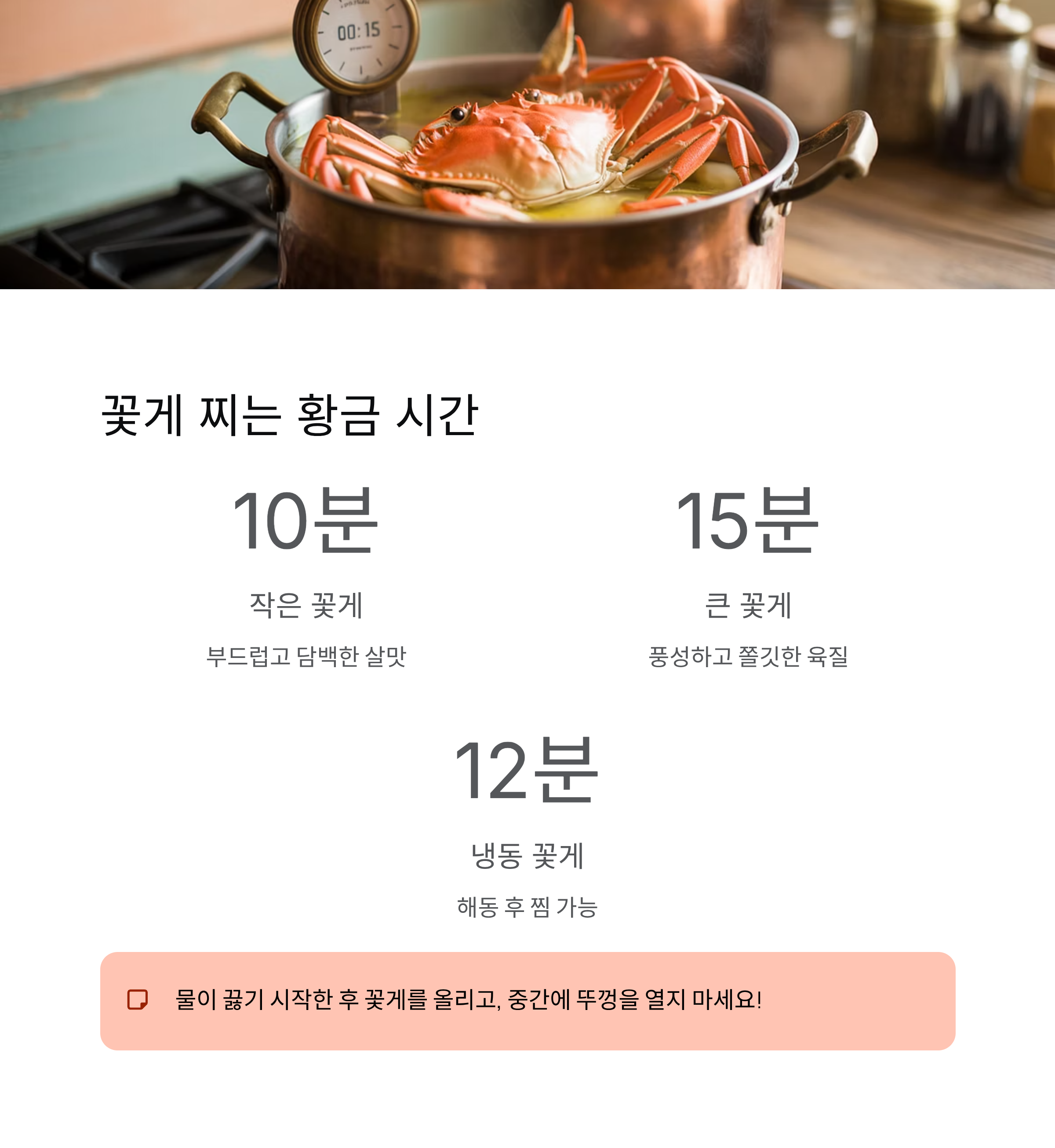 | 냉동 꽃게 | 약 12분 | 해동 후 찜 가능 |