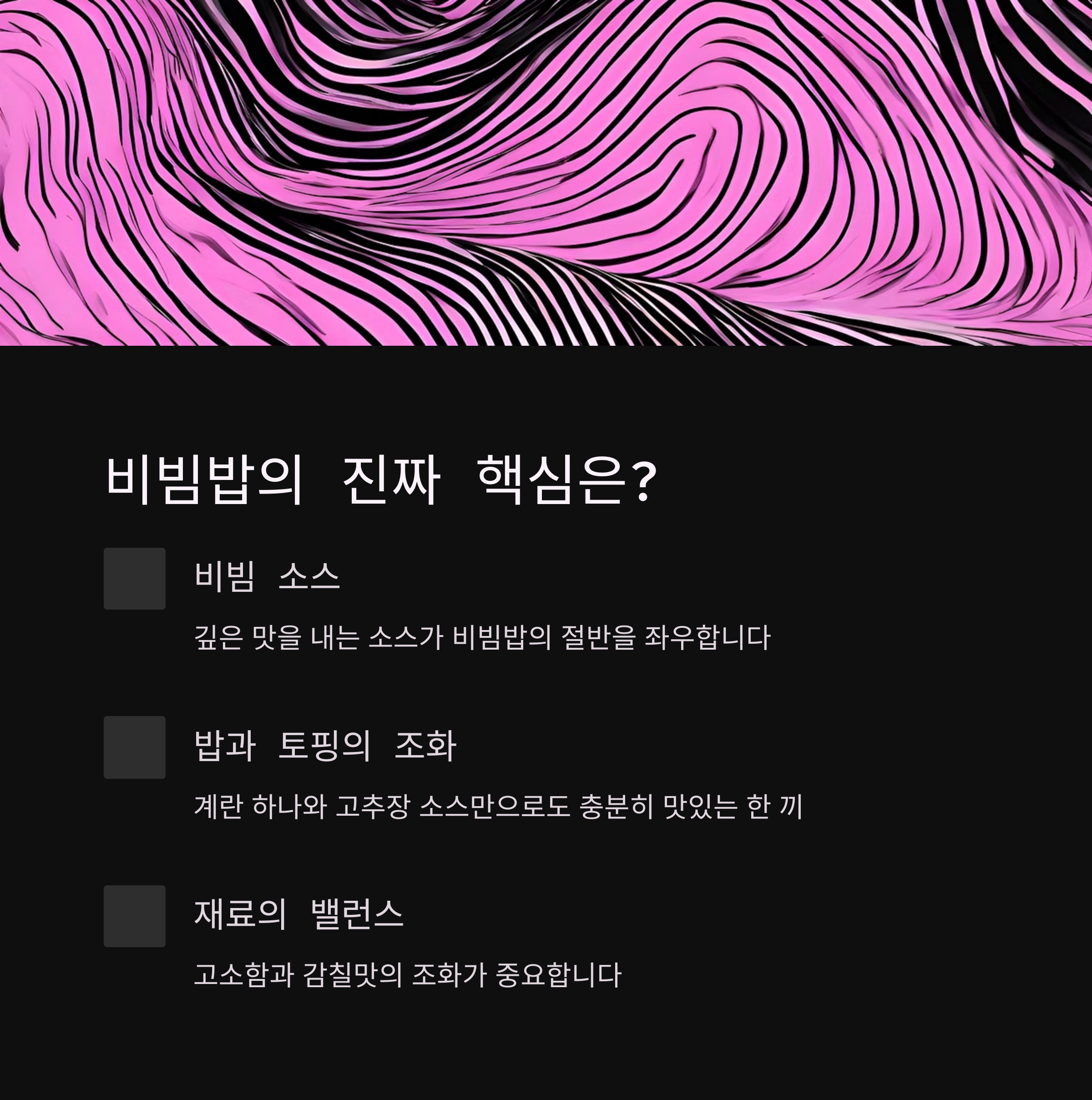 비빔밥의 핵심은 나물이 아니라 비빔 소스와 밥, 그리고 간단한 토핑의 조화입니다