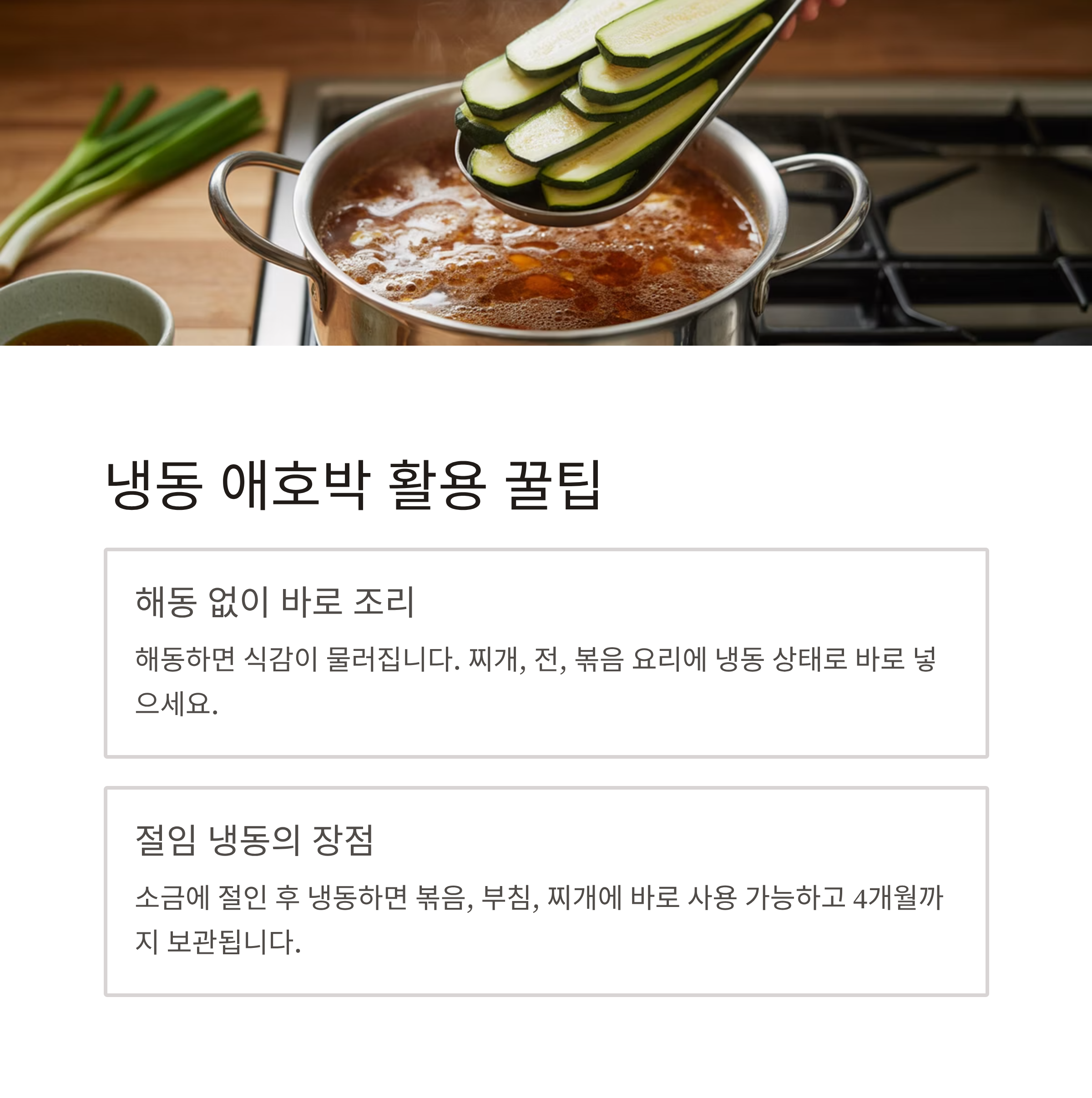 - 냉동 애호박은 해동 없이 바로 조리해야 식감이 물러지지 않습니다.