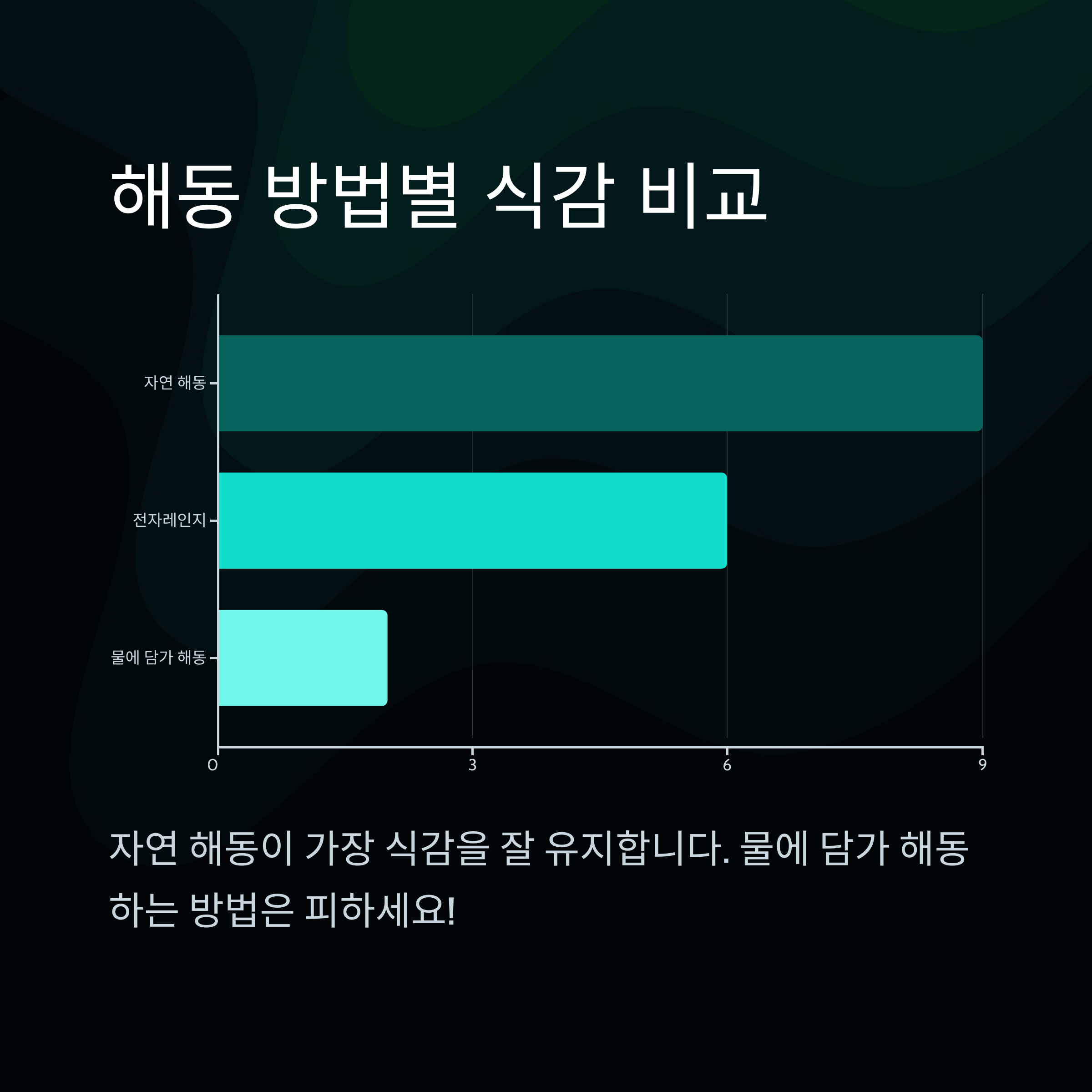 | 물에 담가 해동 | 매우 낮음 | 5분 전후 | 식감 무너짐, 영양소 손실 큼 |