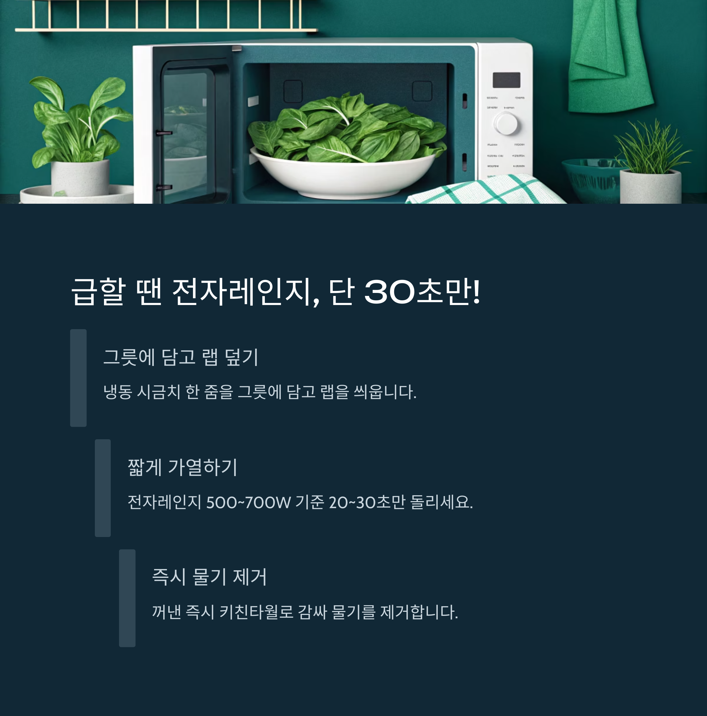 이번 글에서는 냉동 시금치를 ‘물기 없이, 식감 좋게’ 해동하는
