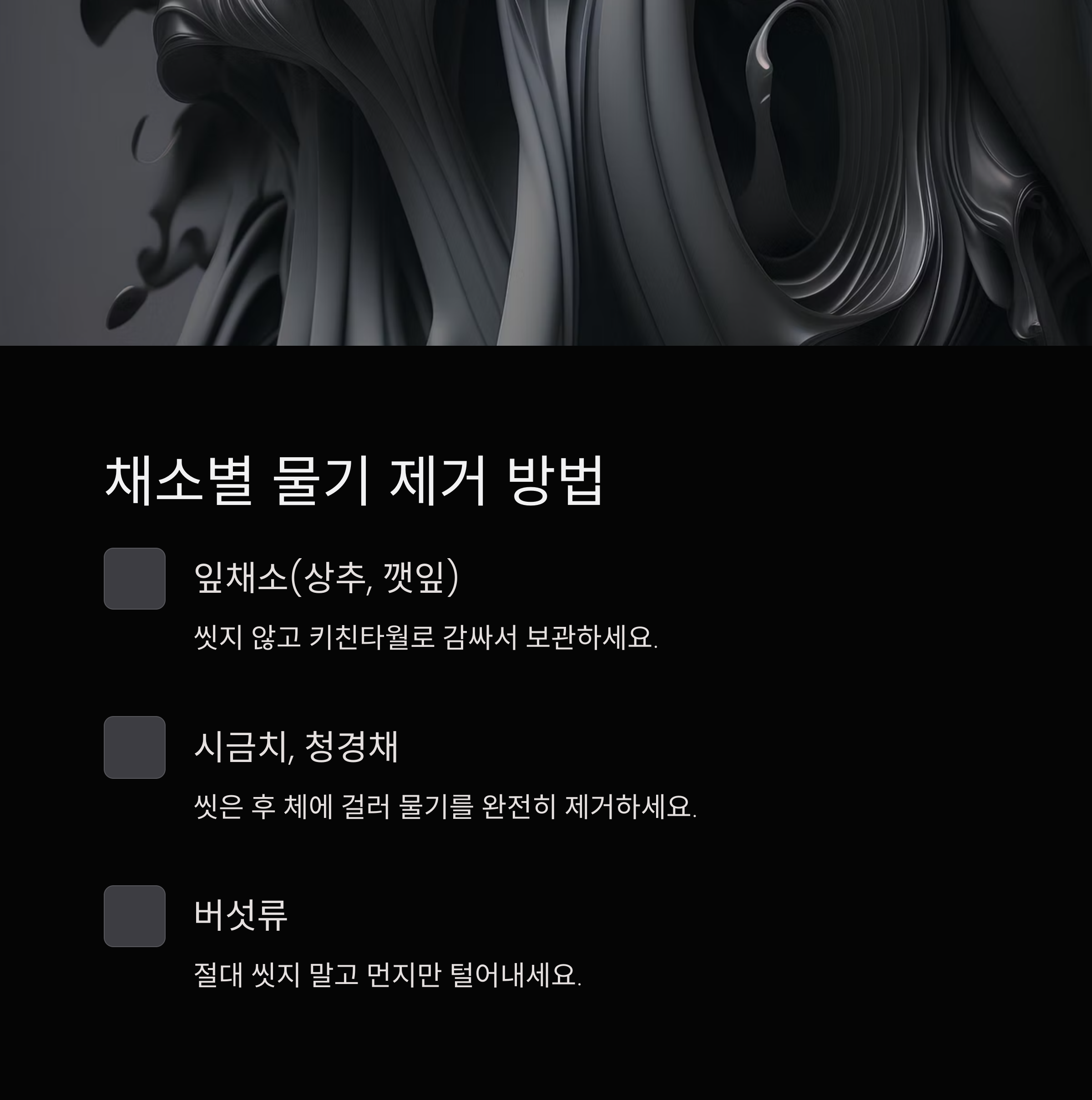 | 상추, 깻잎 | 씻지 않고 키친타월로 감싸기 | 절대 씻지 말고 그대로 보관 |