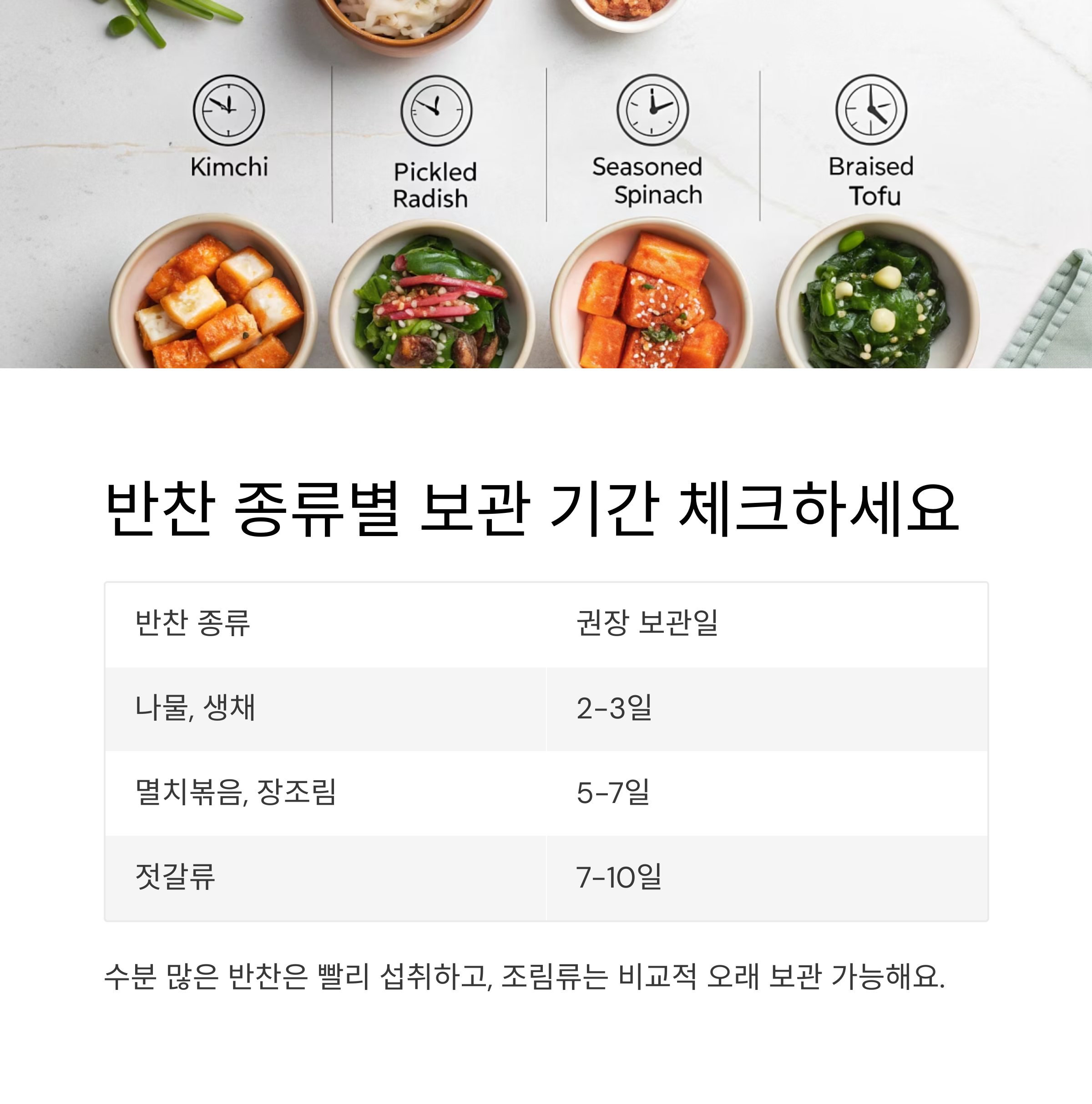 | 멸치볶음, 장조림 | 5~7일 | 기름기 유의, 밀폐보관 |