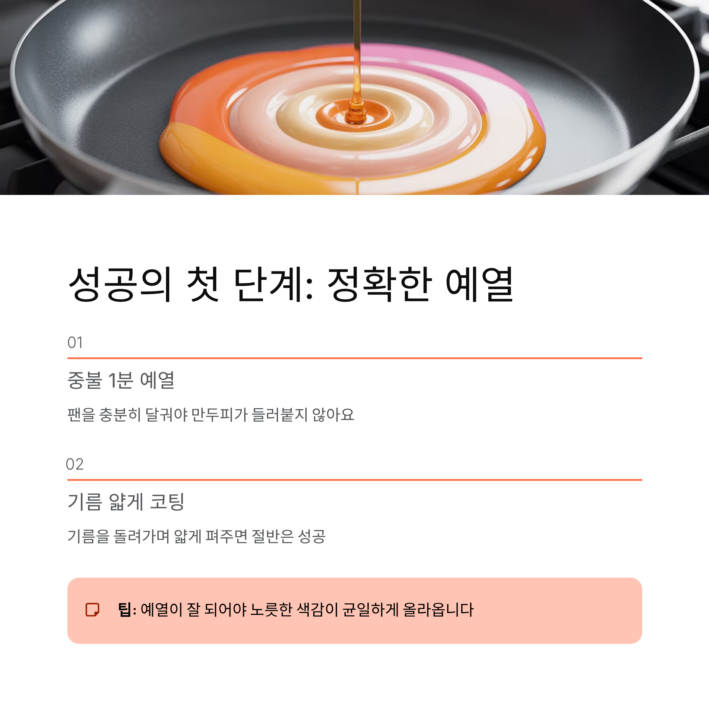 팬을 충분히 달구지 않은 상태에서 굽기 시작하면 만두피가 들러붙고 바삭함도 살지 않습니다. 중불에서 약 1분간 예열한 후 기름을 얇게 코팅하듯 돌려주는 것만으로도 절반은 성공한 셈이에요. 예열이 잘 되어 있어야 노릇한 색감도 균일하게 올라옵니다.