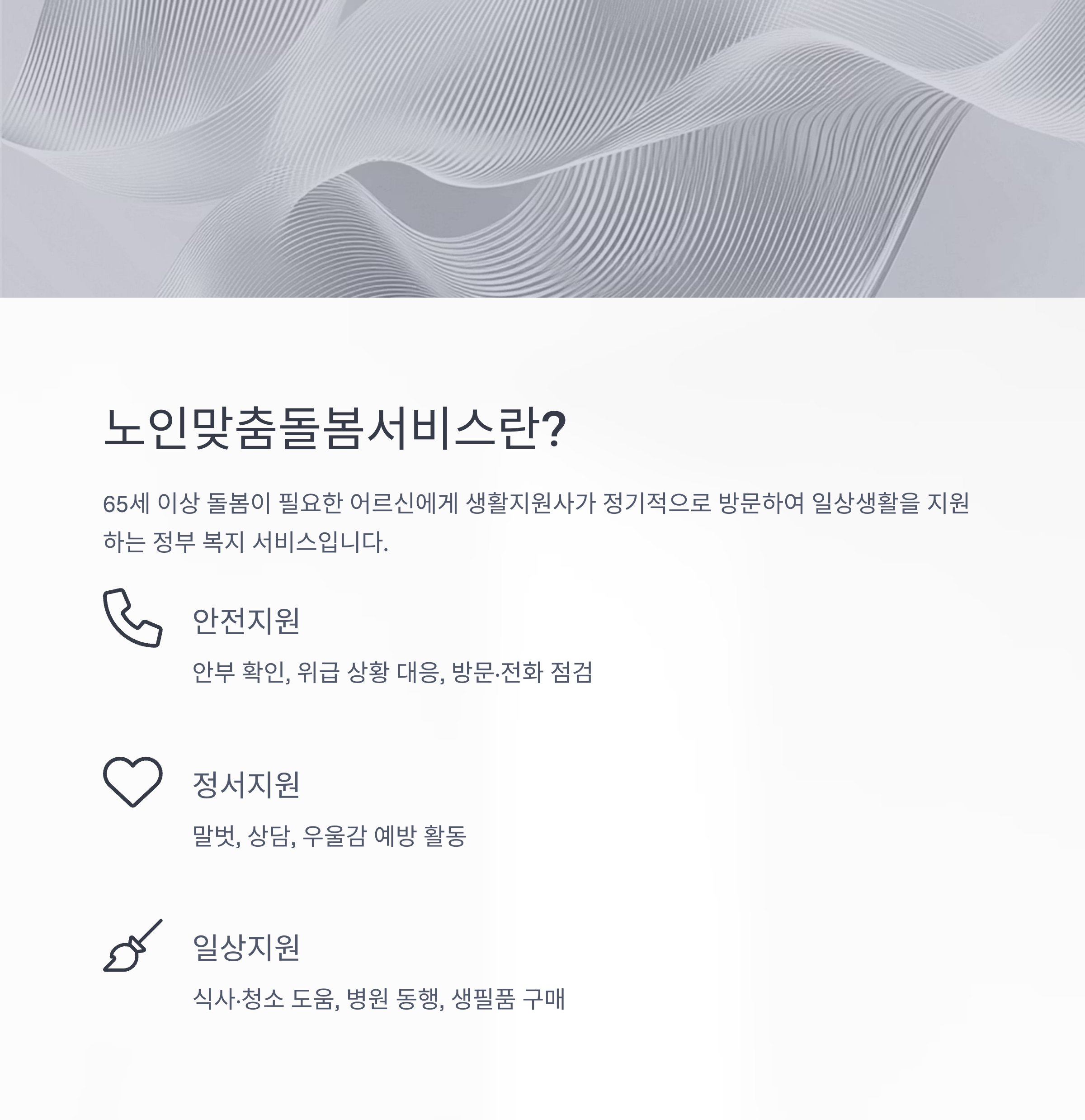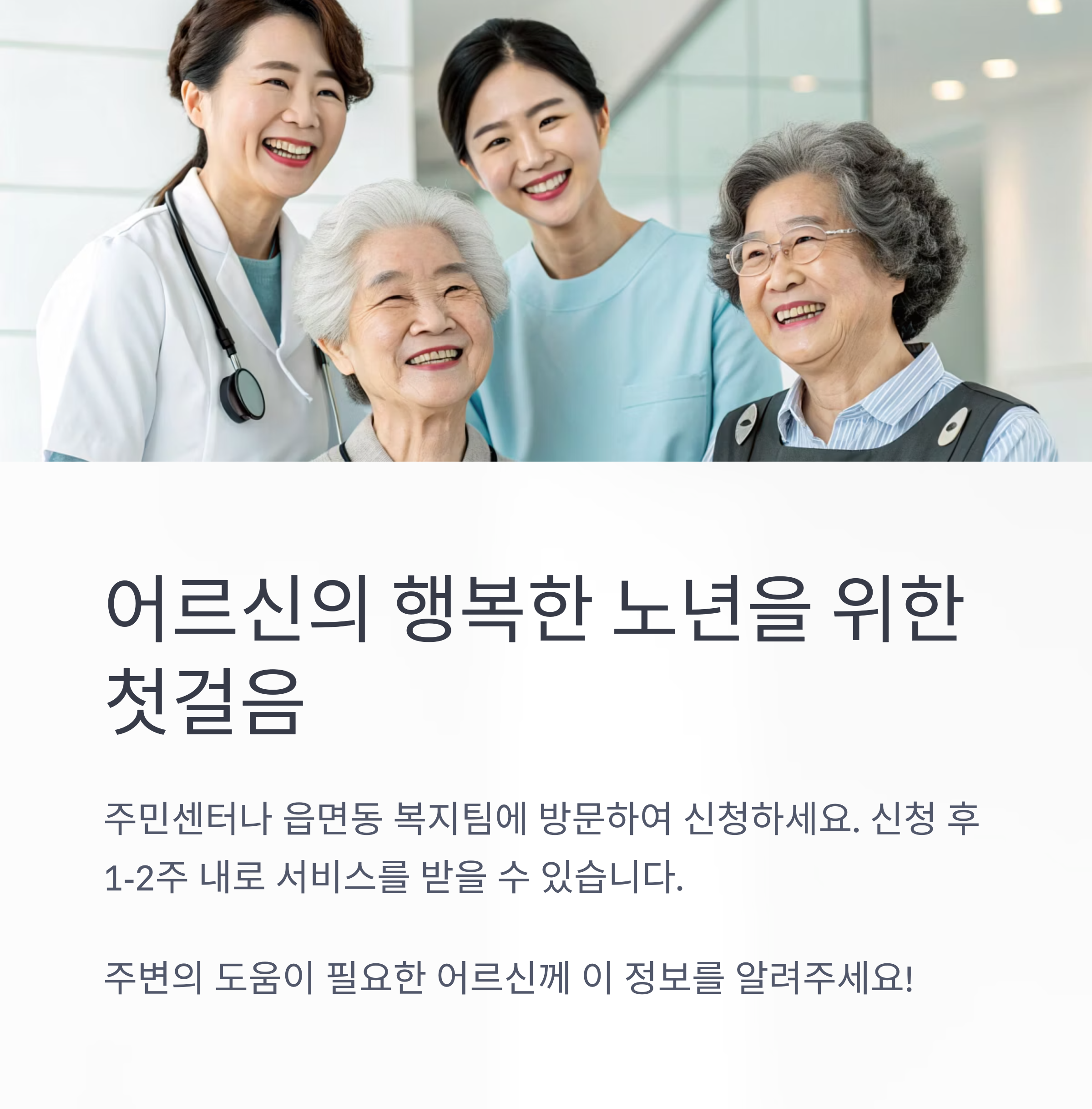 대상자 | 만 65세 이상 독거노인, 조손가정 노인, 장기요양 미등급자 등 |