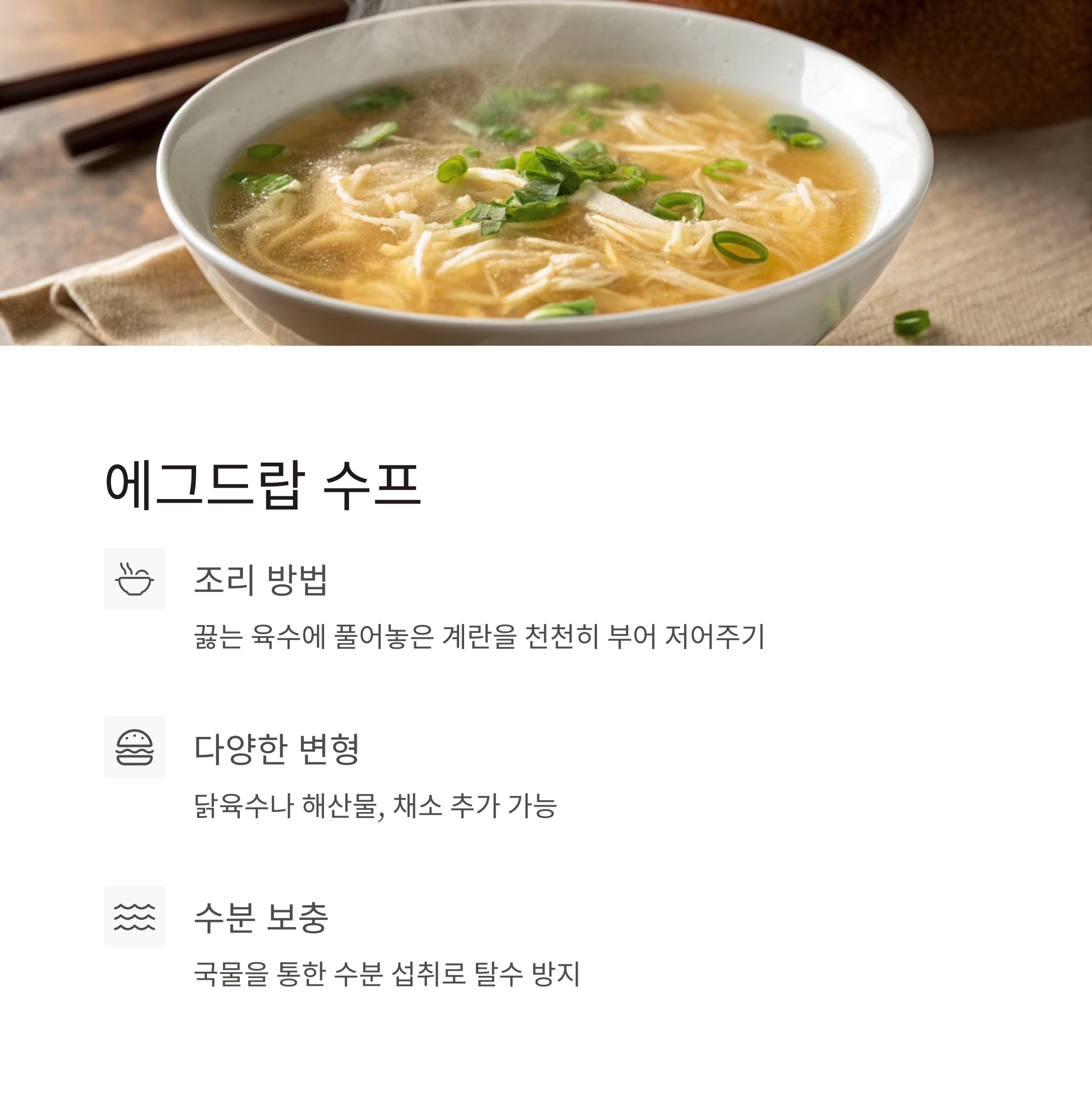 - 조리 방법: 끓는 육수에 풀어놓은 계란을 천천히 부어가며 저어주면 얇은 계란 띠가 만들어집니다.