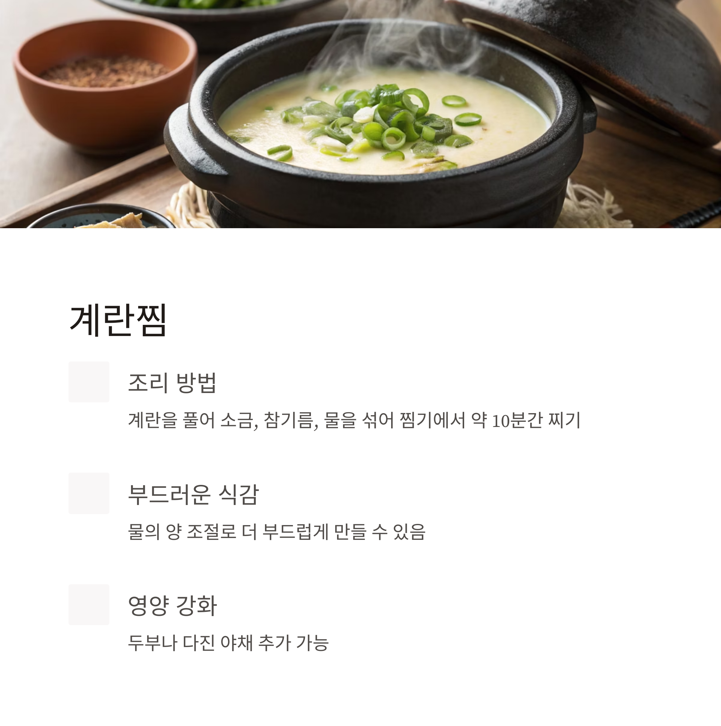 - 조리 방법: 계란을 풀어 소금, 참기름, 물을 섞어 김이 오른 찜기에 넣고 약 10분간 찝니다.