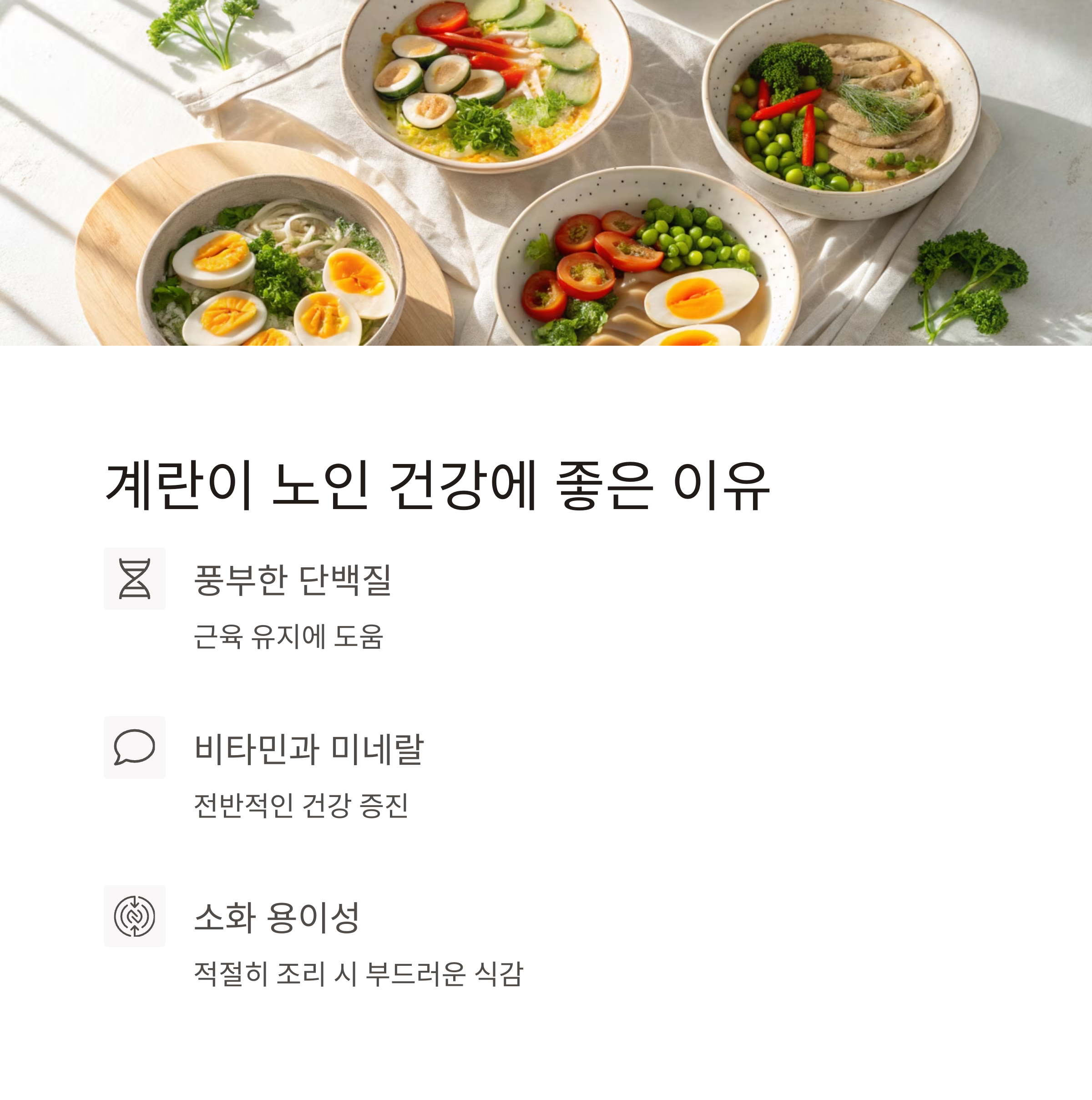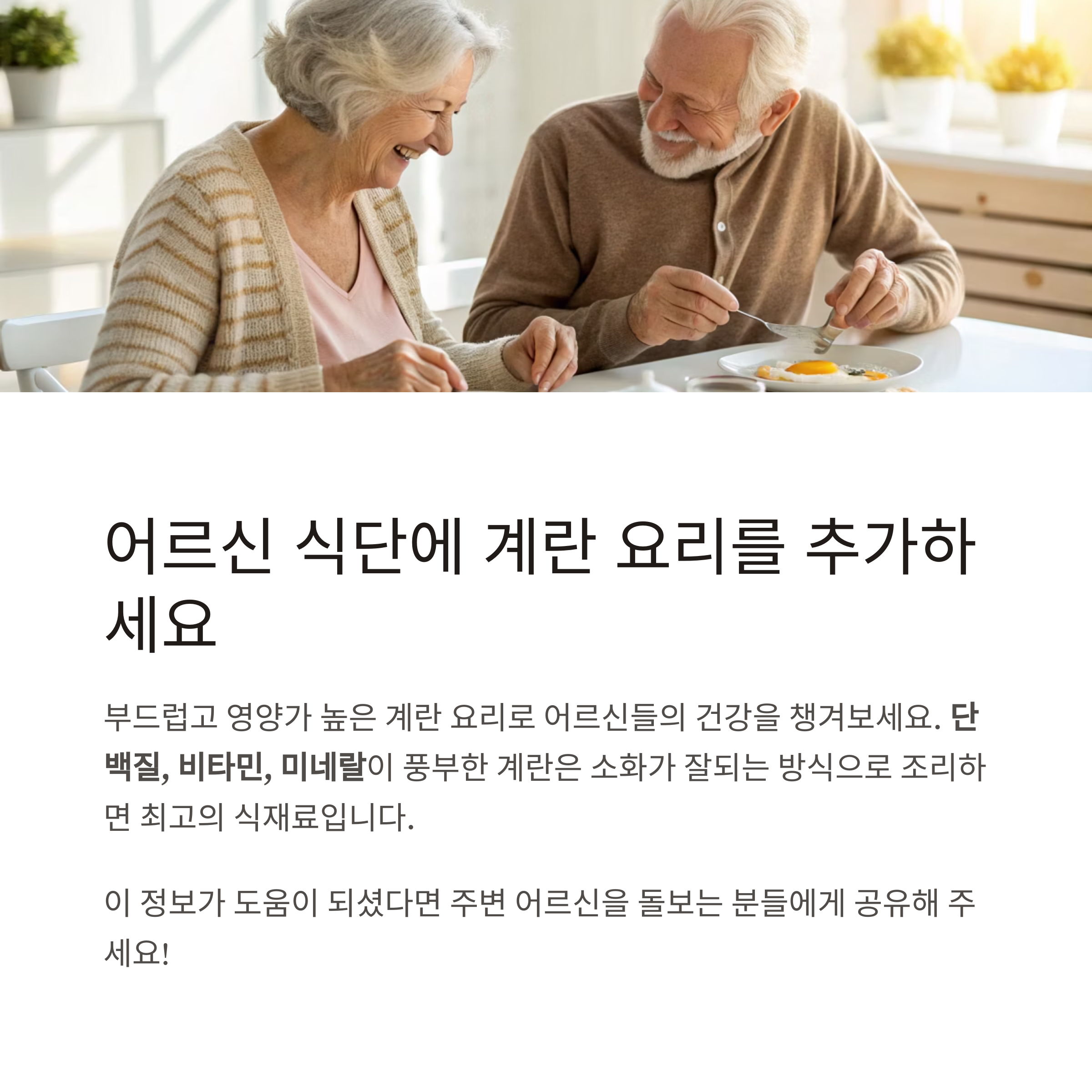 - 장점: 부드러운 흰자와 반숙 노른자가 어르신들에게 적합합니다.