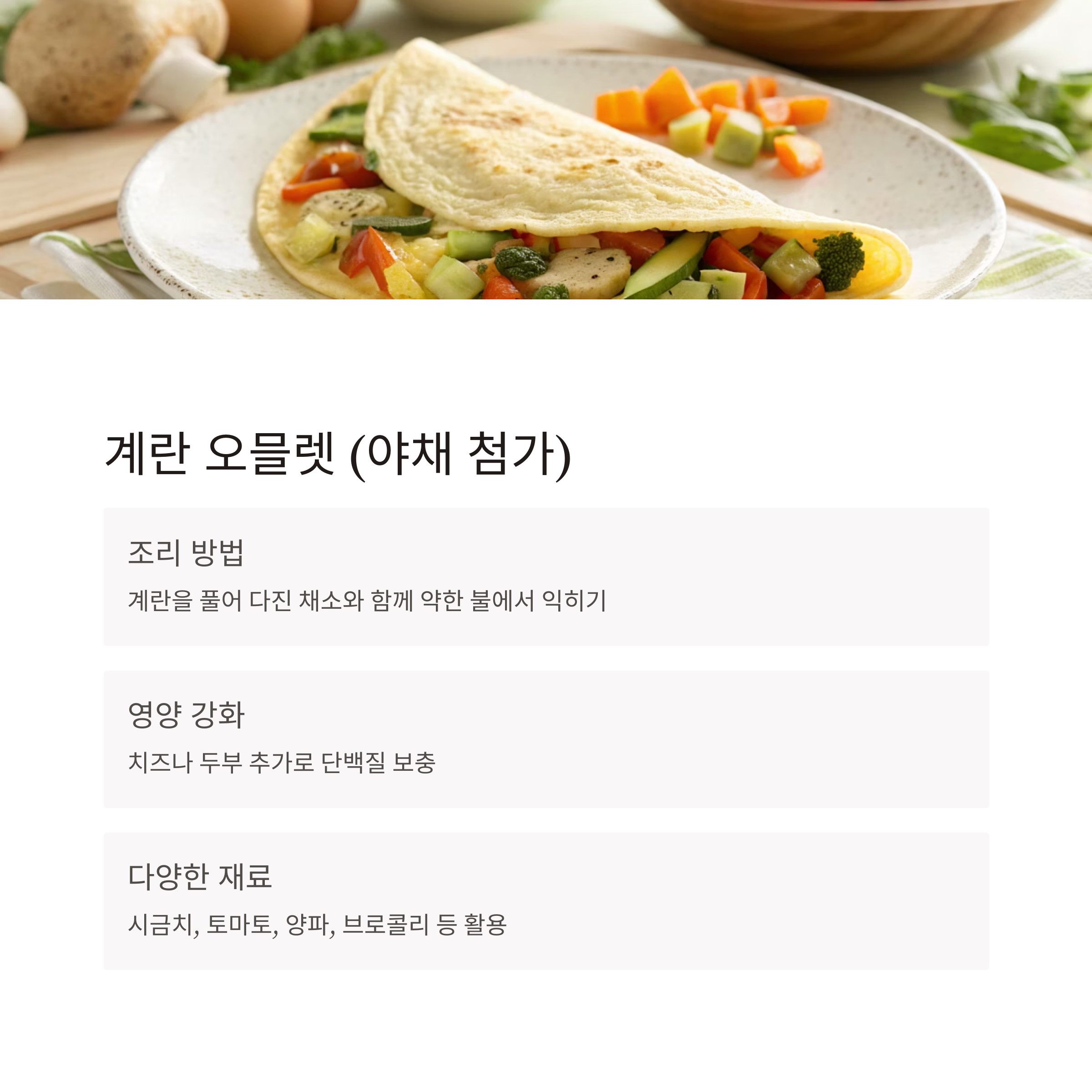 - 조리 방법: 계란을 풀어 다진 채소와 함께 약한 불에서 익혀줍니다. 치즈나 두부를 추가하면 단백질 보충 효과가 있습니다.
