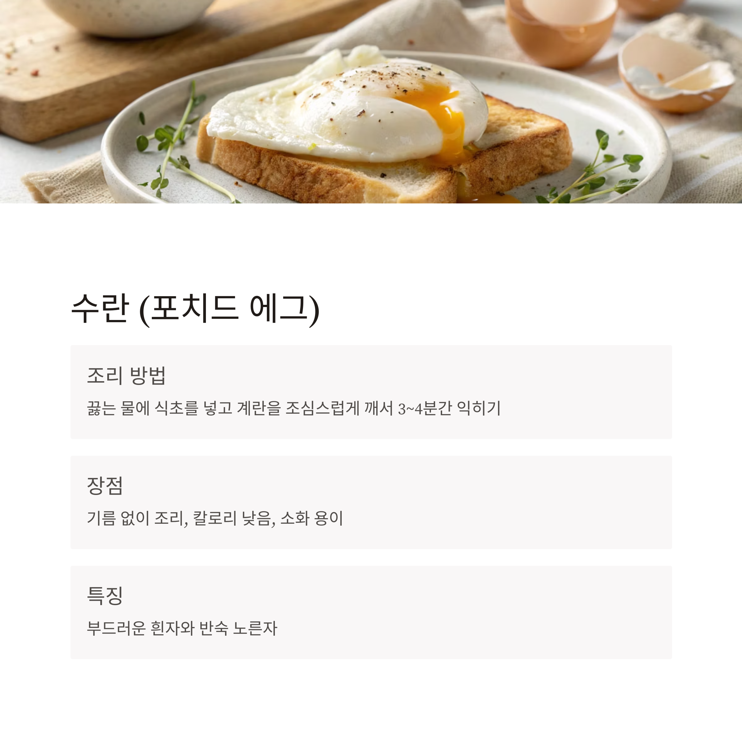 - 조리 방법: 끓는 물에 약간의 식초를 넣고, 저은 후 계란을 조심스럽게 깨서 3~4분간 익힙니다.