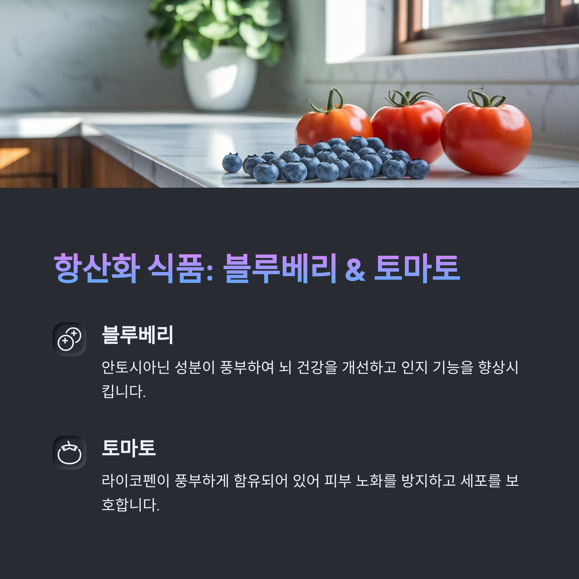 블루베리, 토마토, 녹차, 브로콜리 등 항산화 성분이 풍부한 식품이 좋습니다.