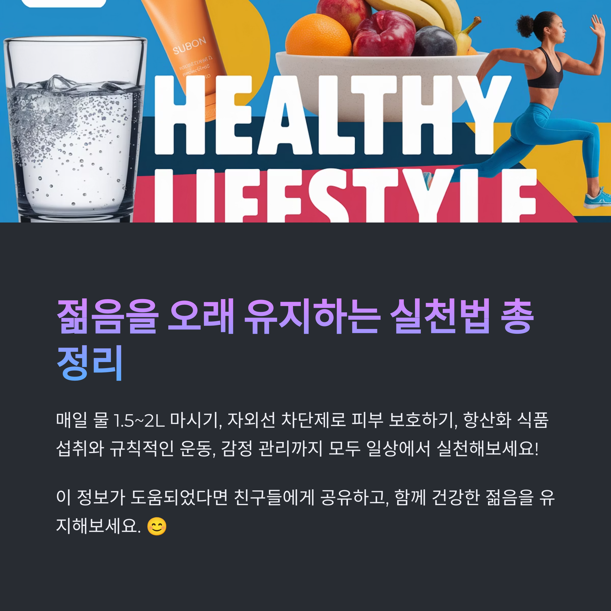 피부 관리, 식습관, 운동, 마음가짐까지 여러분이 실천 중인 노화 예방 꿀팁을 댓글로 공유해주세요. 함께 나누면 더 오래, 건강하게 젊음을 지킬 수 있어요!