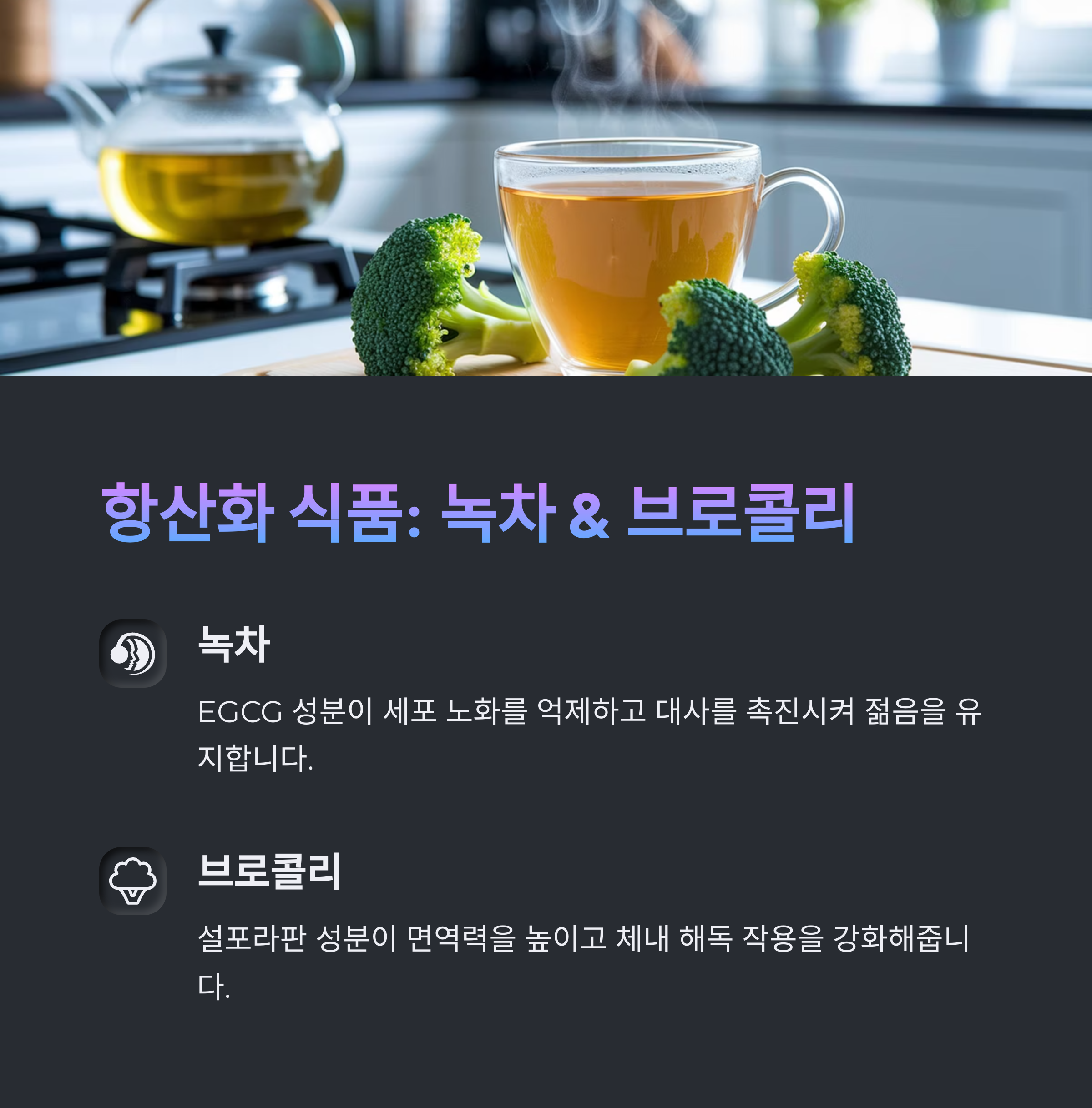 | 블루베리, 녹차, 브로콜리, 토마토 | 유산소 + 근력 운동 병행, 꾸준함이 핵심 | 충분한 수면, 스트레스 완화, 명상 |