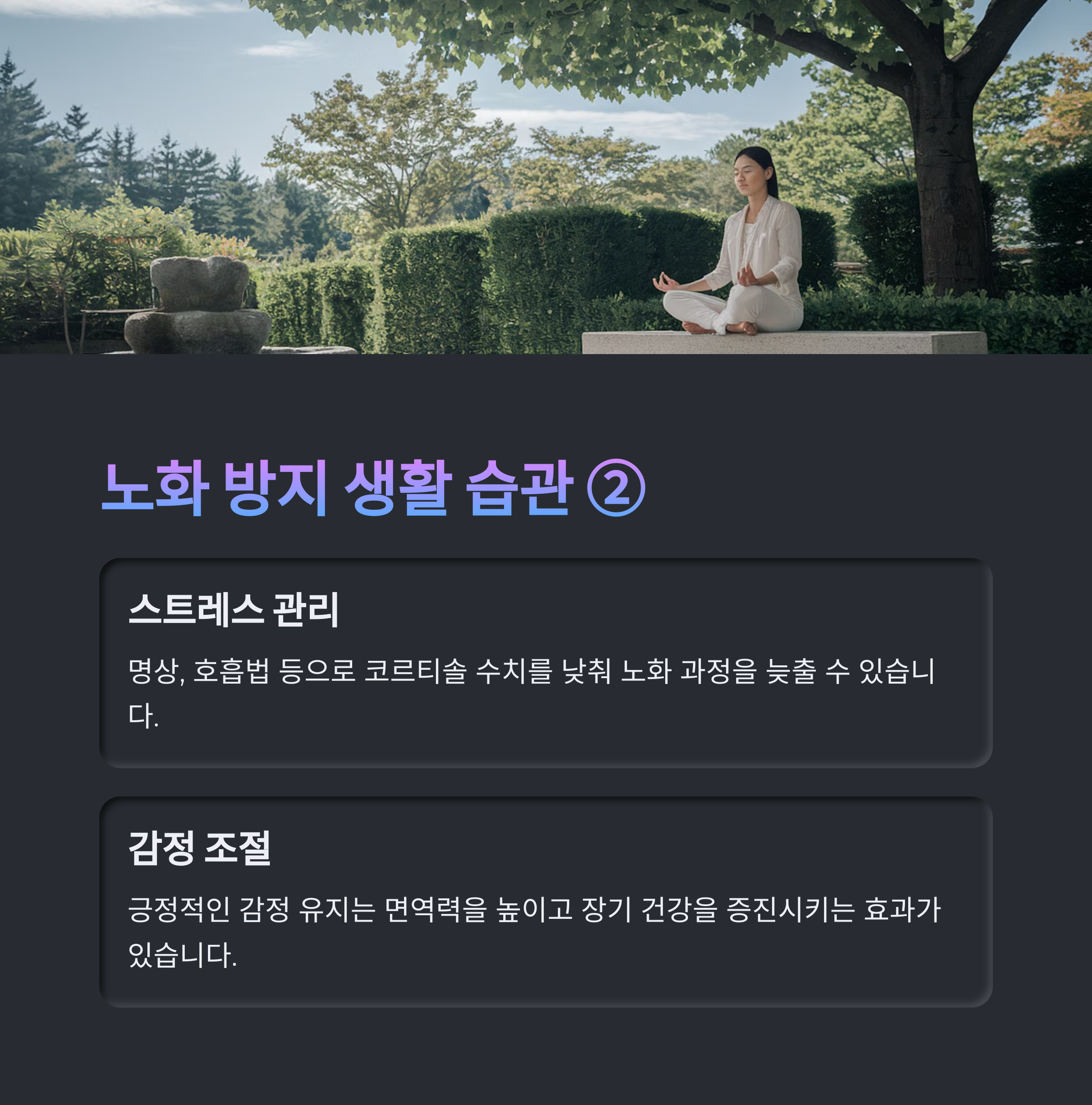 충분한 수면, 스트레스 관리, 명상, 긍정적인 사고도 세포 회복과 노화 속도 조절에 필수입니다. 특히 밤 11시 이전 취침, 7시간 수면은 성장 호르몬 분비를 유도해 자연적인 회복과 재생을 도와줍니다.