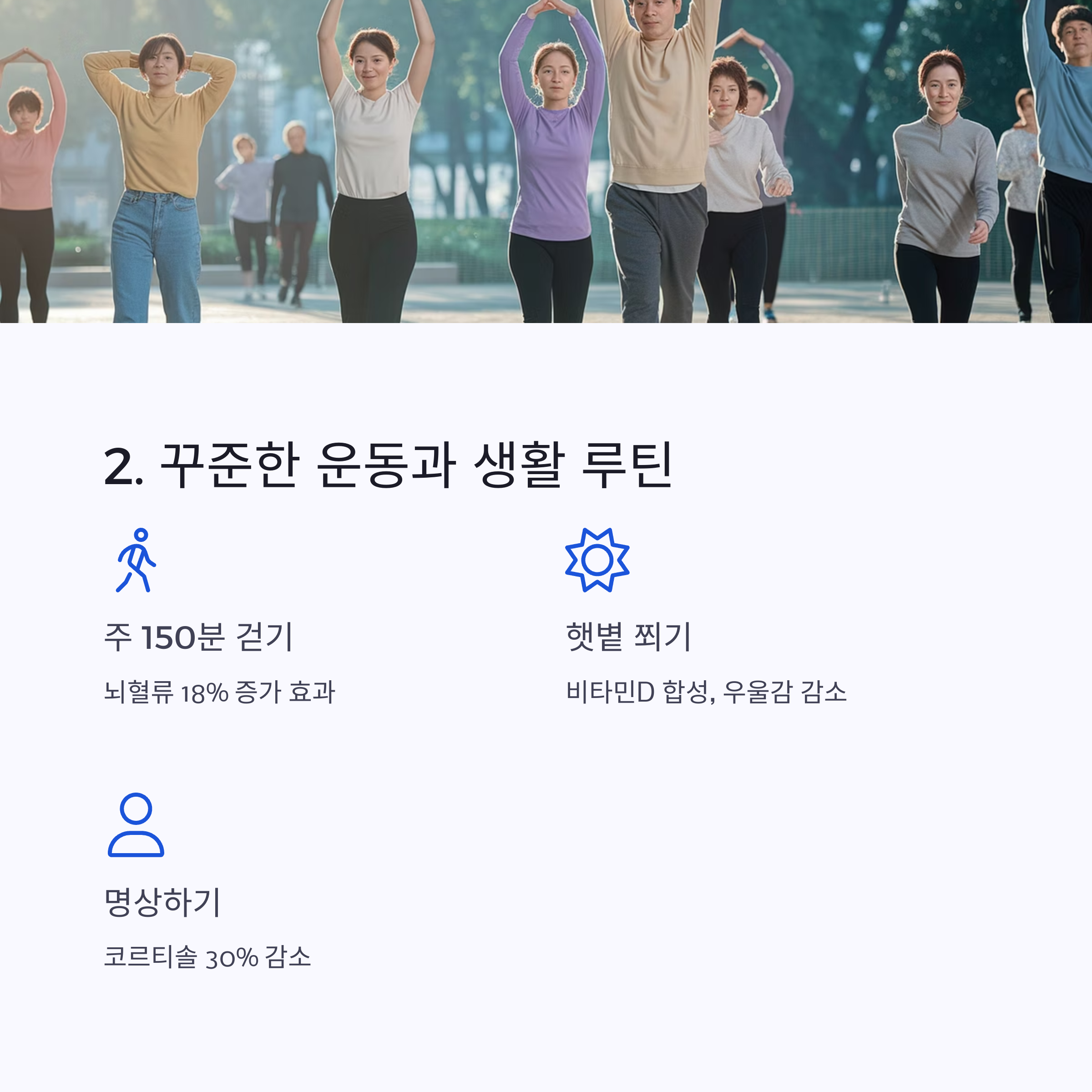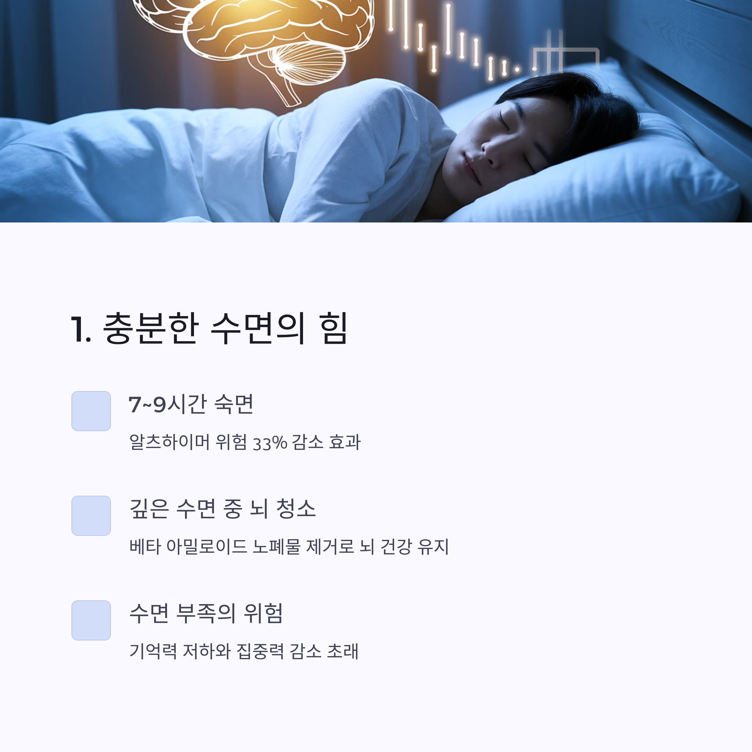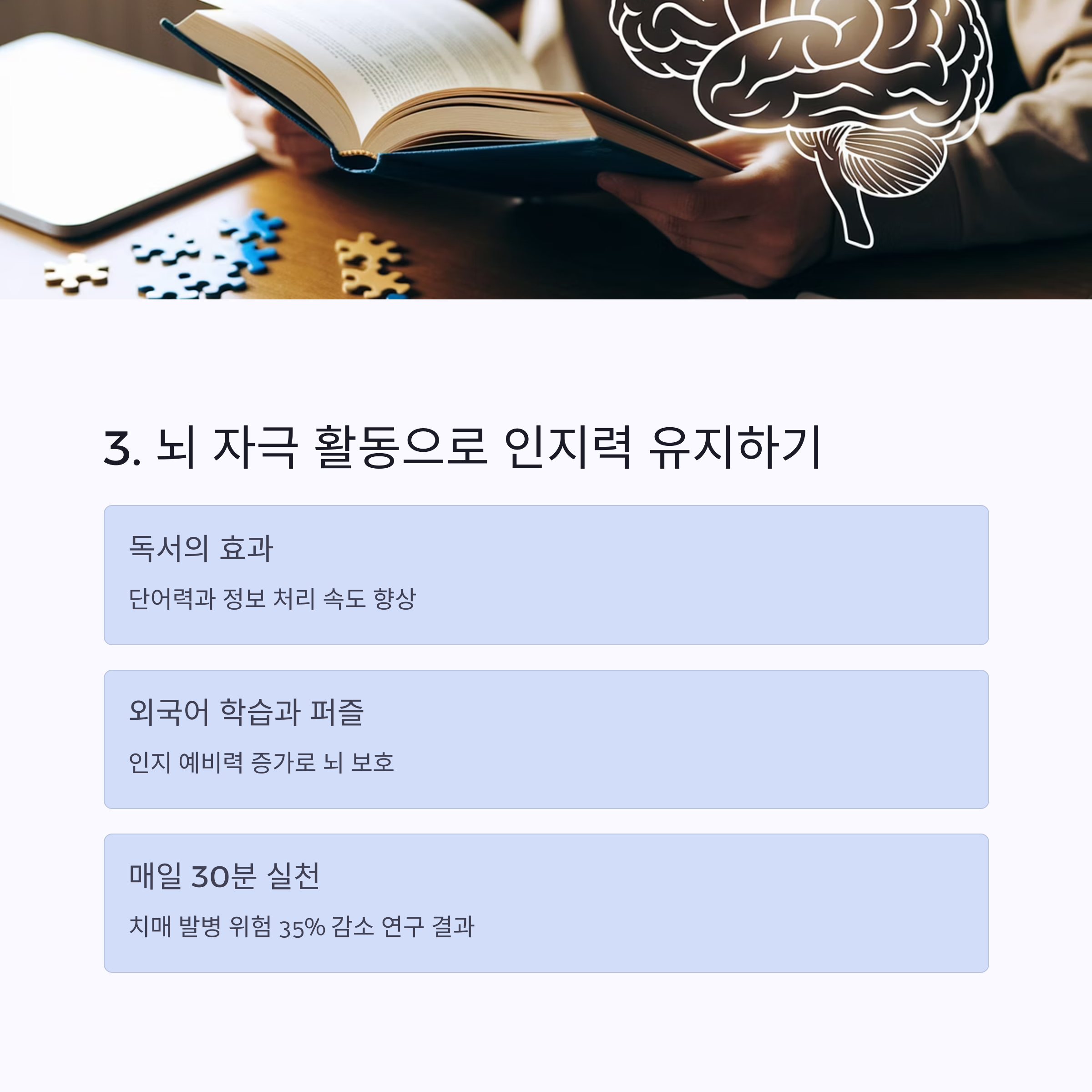 | 7~8시간 수면, 일정한 기상 시간 | 독서, 악기, 외국어, 퍼즐 | 걷기, 명상, 햇빛, 감정 표현 |