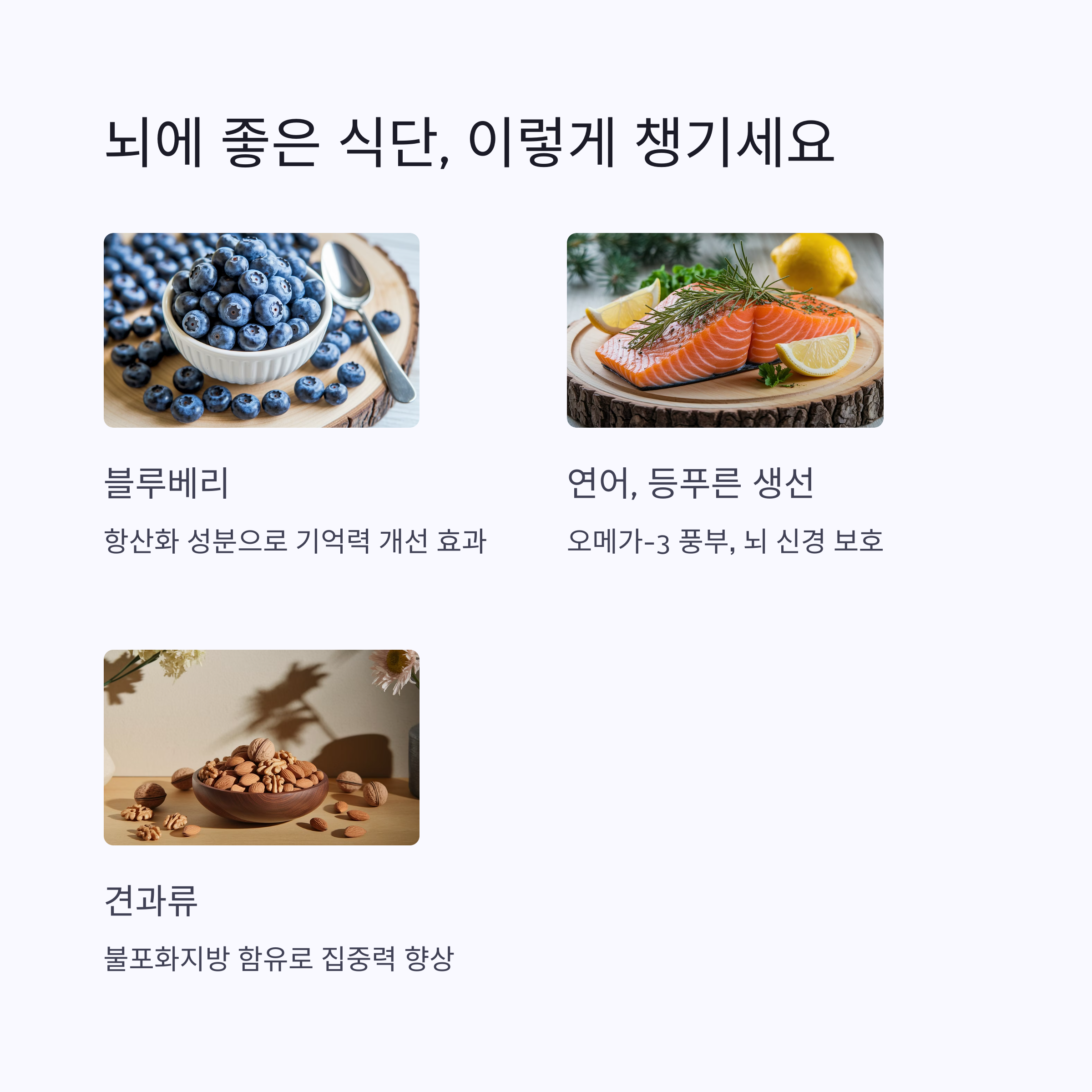 블루베리, 연어, 견과류, 계란, 녹황색 채소 등이 기억력과 집중력 향상에 도움을 줍니다.