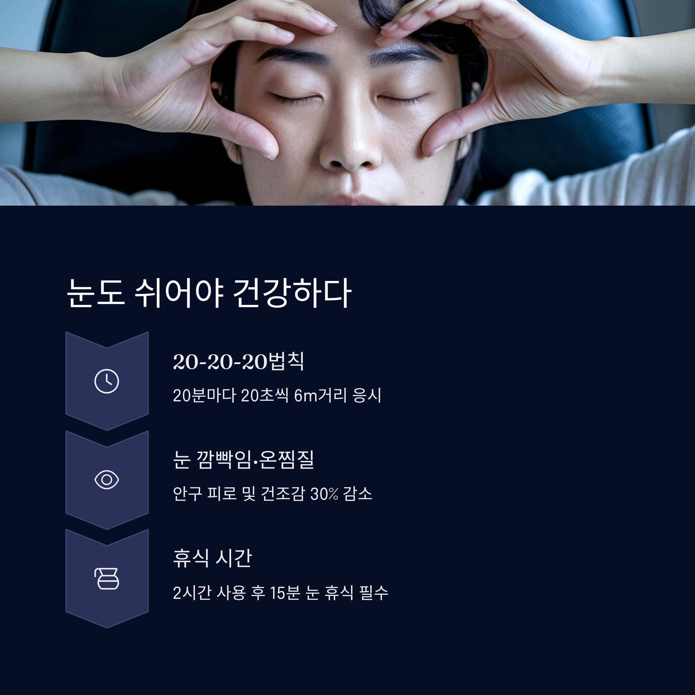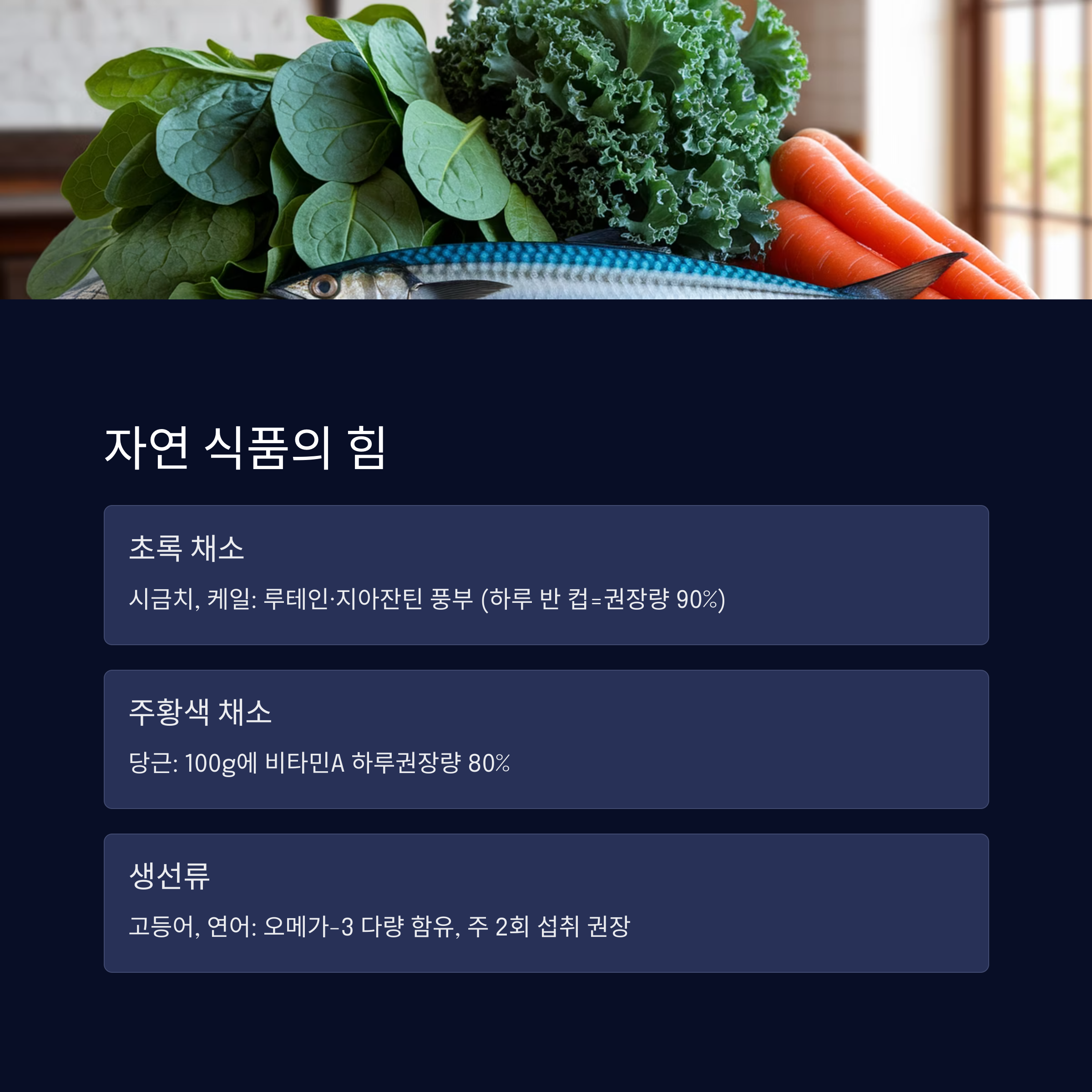 | 루테인, 지아잔틴, 비타민A, 오메가-3 | 시금치, 당근, 고등어, 달걀노른자 | 수분 섭취, 눈 운동, 휴식시간 확보 |