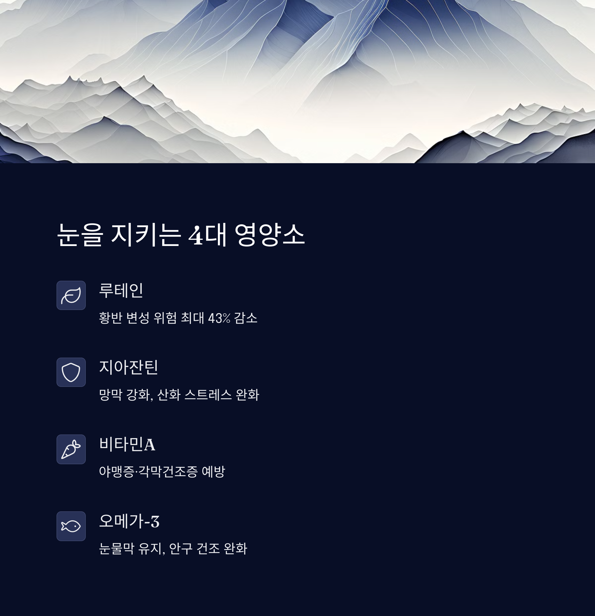 | 눈에 좋은 대표 영양소 | 루테인, 지아잔틴, 비타민A, 오메가-3 |