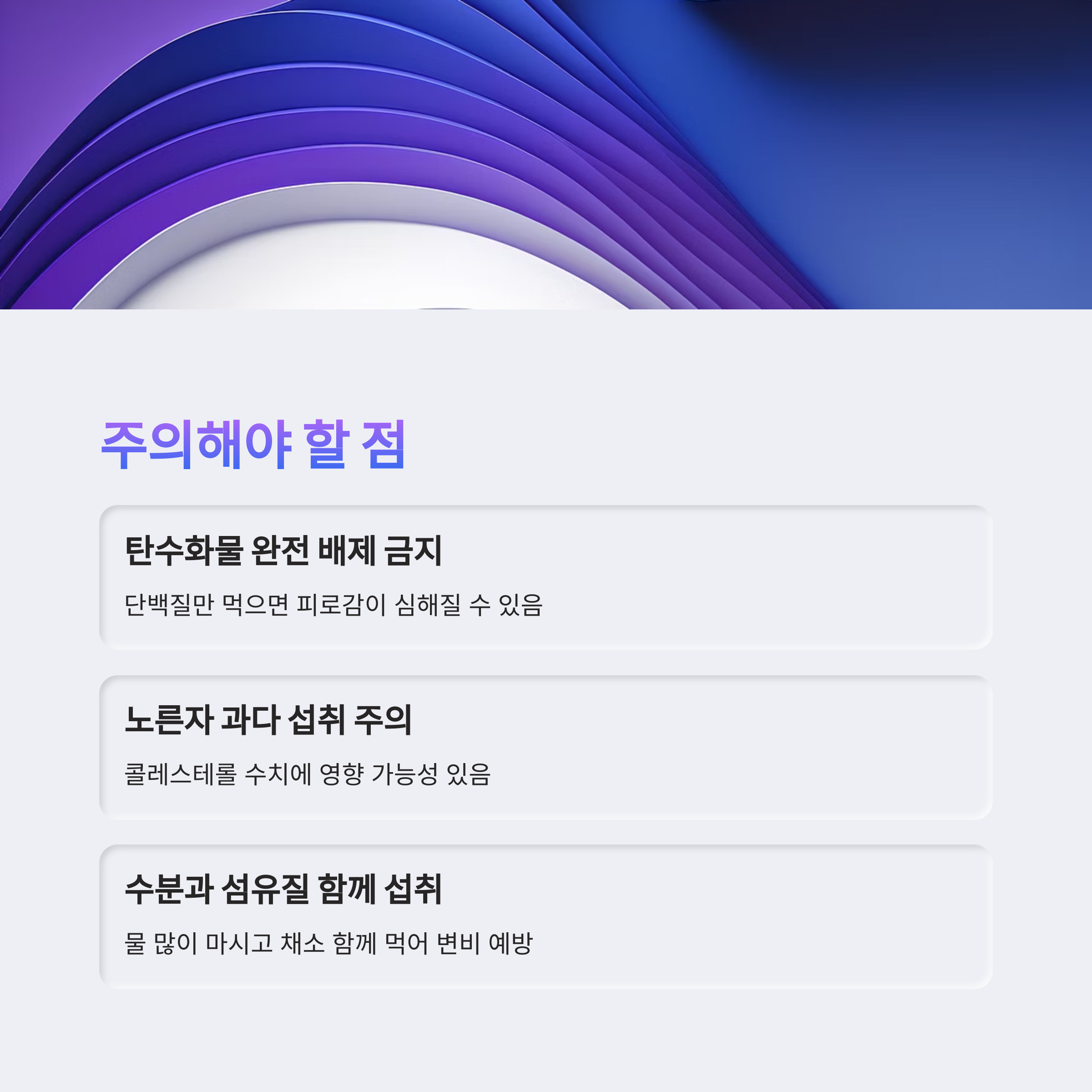 - 단백질만 먹고 탄수화물을 완전히 배제하면 피로감이 심해질 수 있음