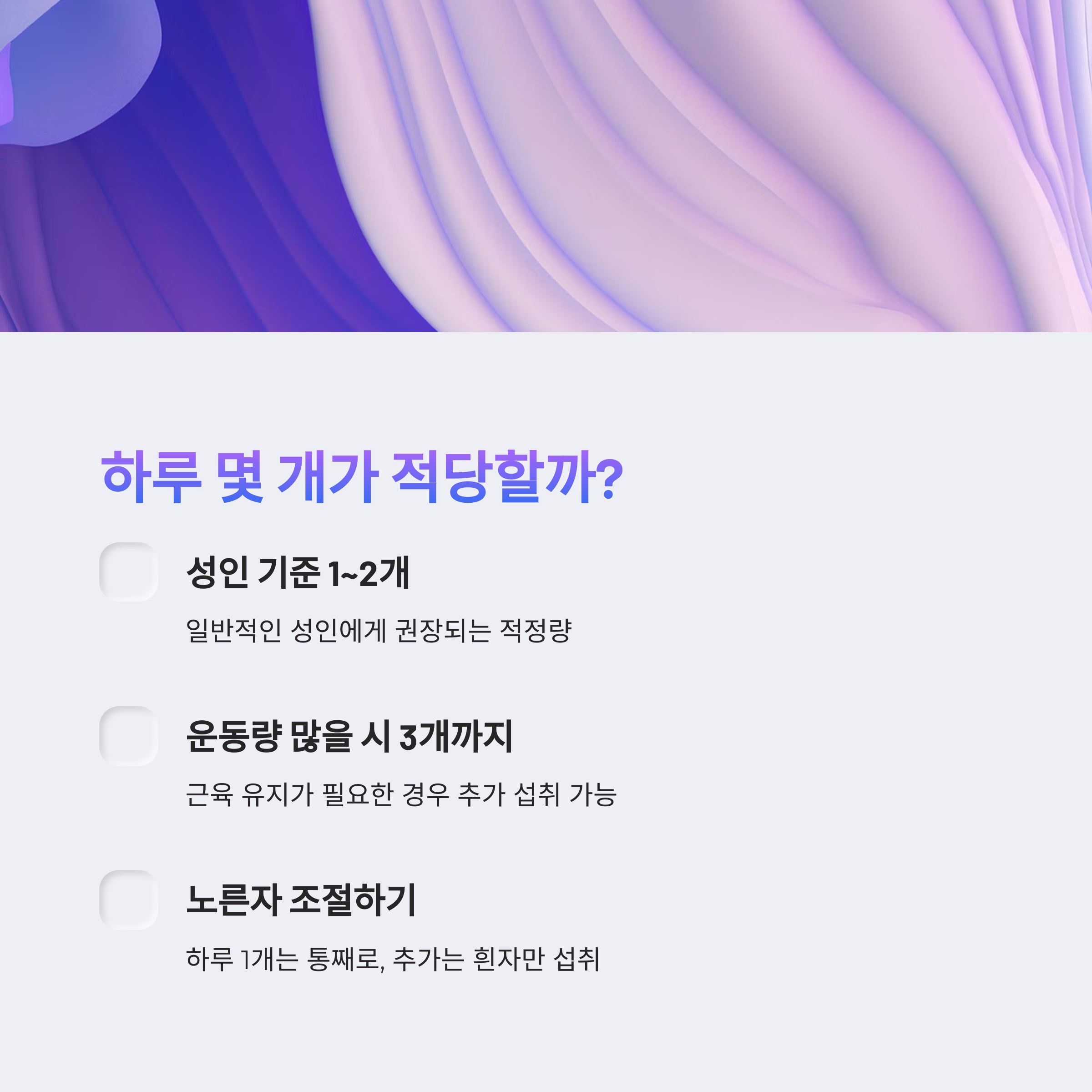 하루에 1개는 통째로, 추가 섭취 시에는 흰자만 섭취하는 방식이 가장 이상적입니다.