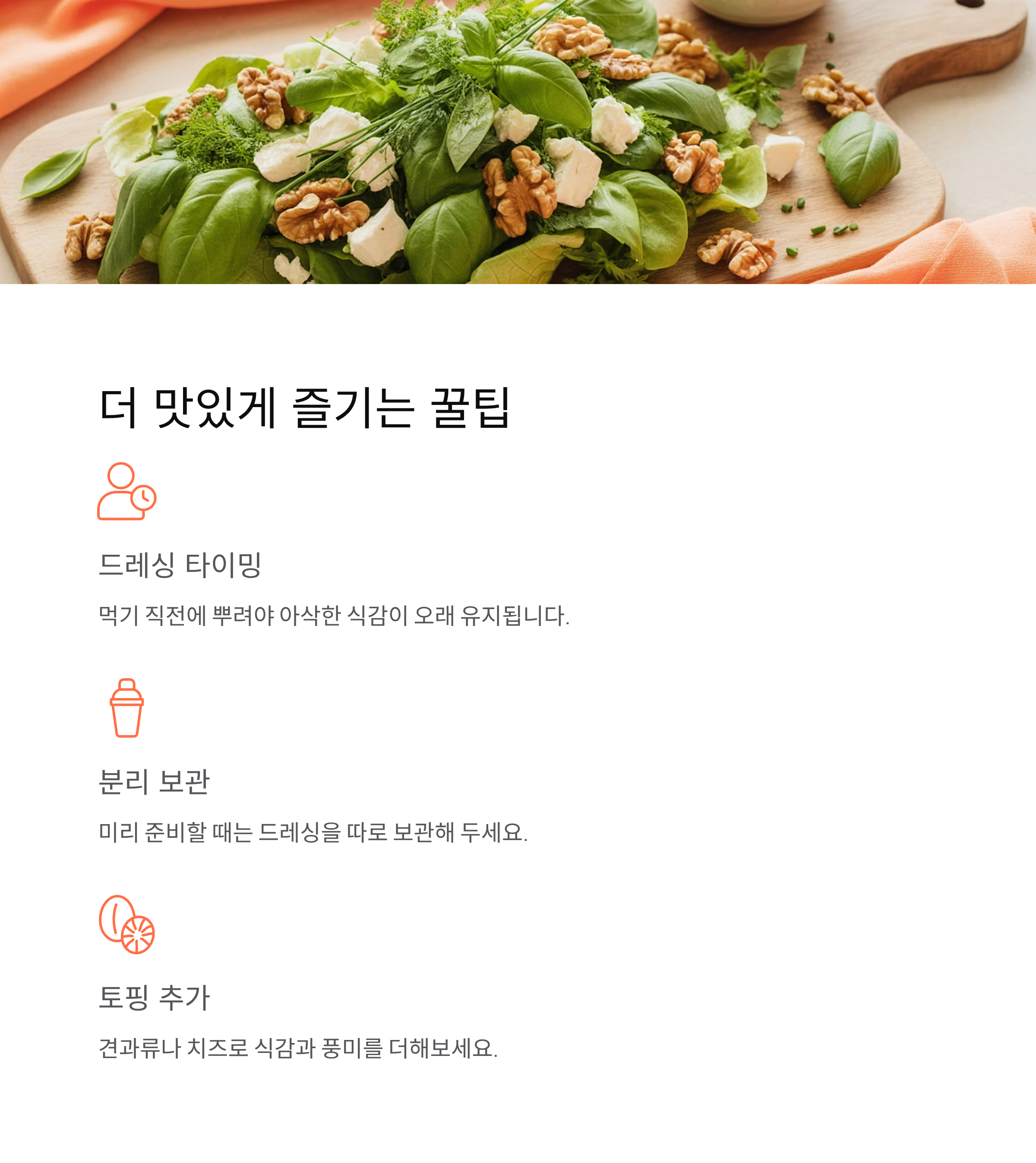 - 샐러드를 미리 준비할 경우 드레싱을 따로 보관해 두는 것이 좋아요.