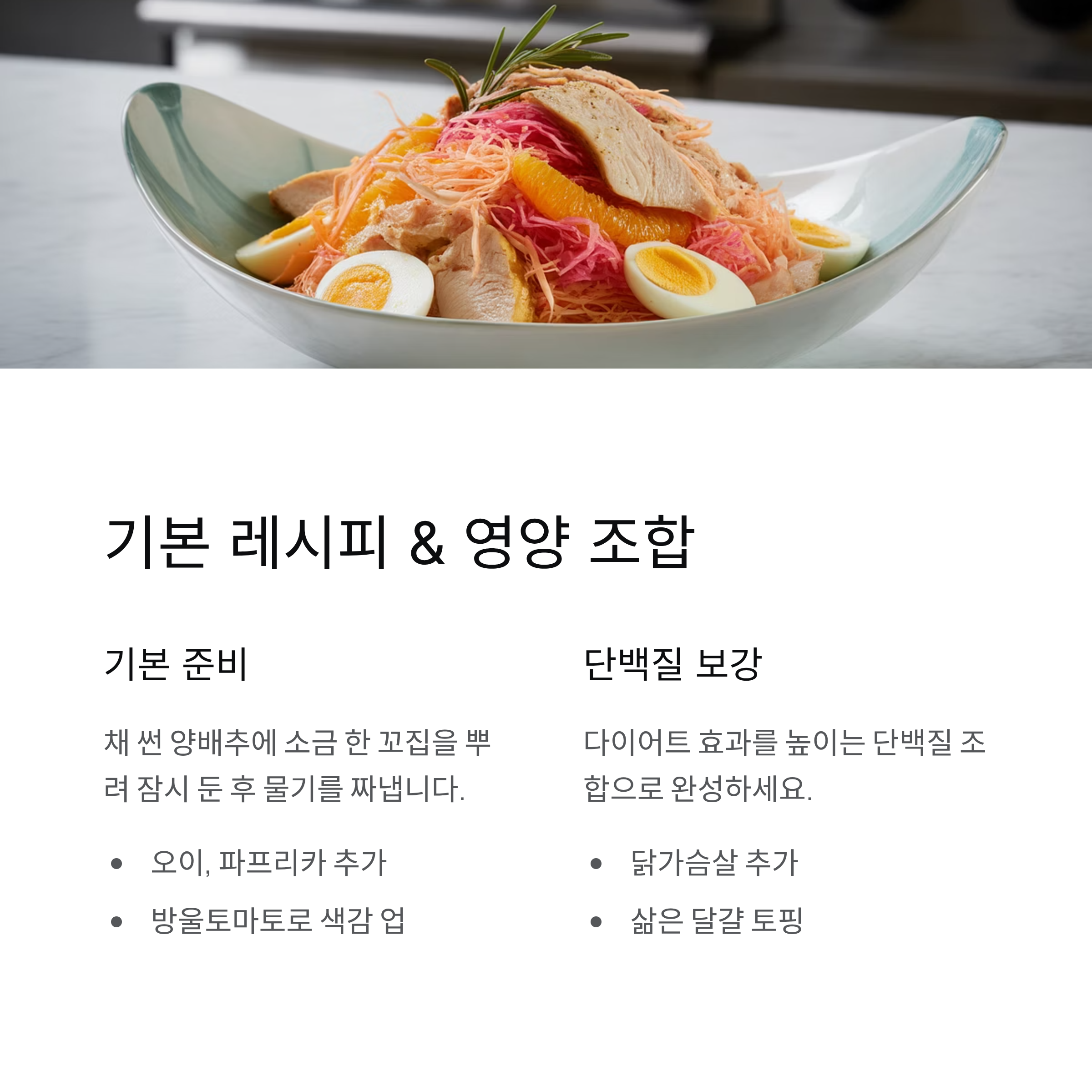양배추는 담백하면서도 부담 없는 채소로, 샐러드로 활용하면 식감이 살아 있어 포만감을 주는 장점이 있습니다.