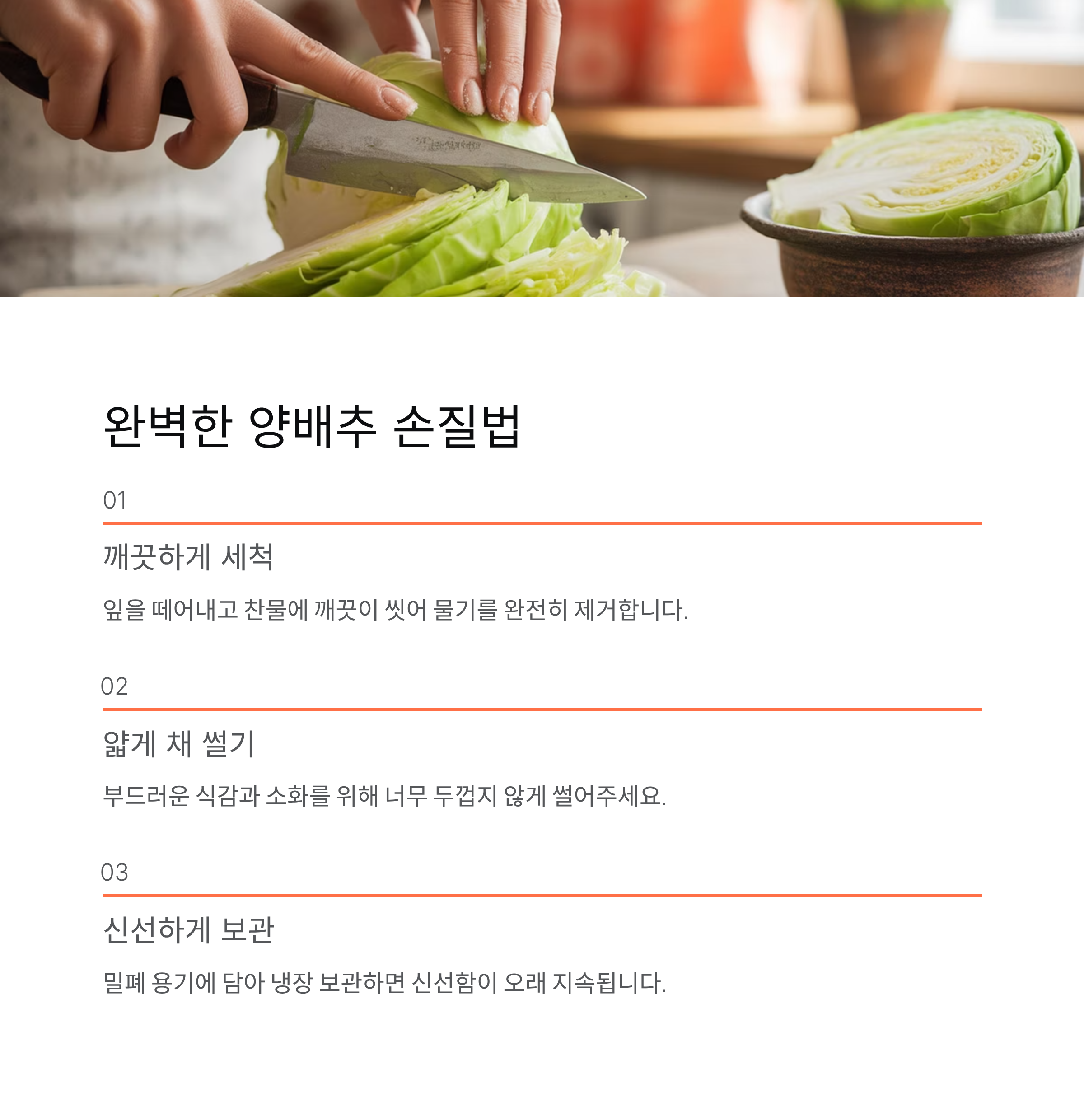 - 남은 양배추는 밀폐 용기에 담아 냉장 보관하면 신선함이 오래갑니다.