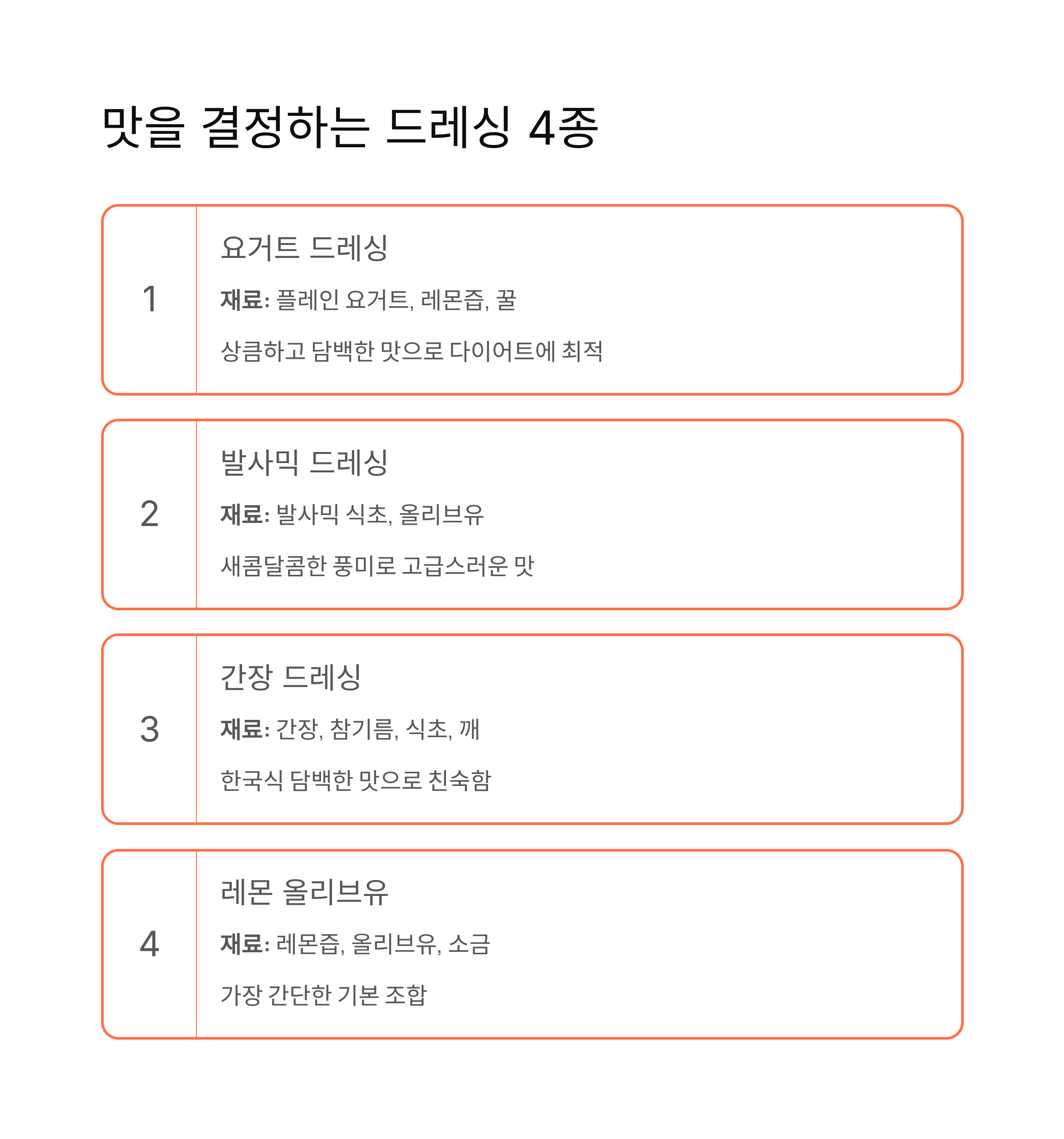 | 간장 드레싱 | 간장, 참기름, 식초, 깨 | 한국식 담백한 맛 |