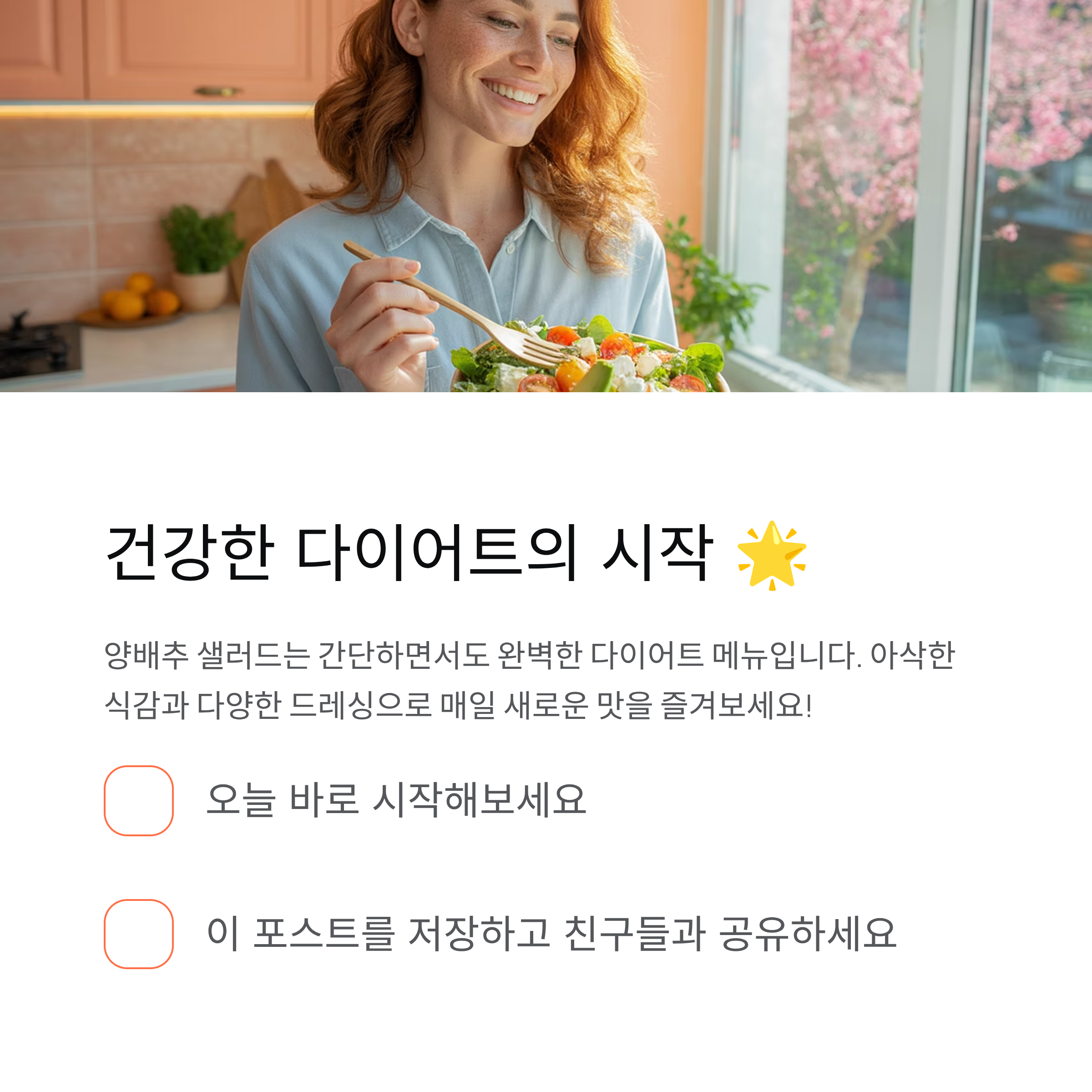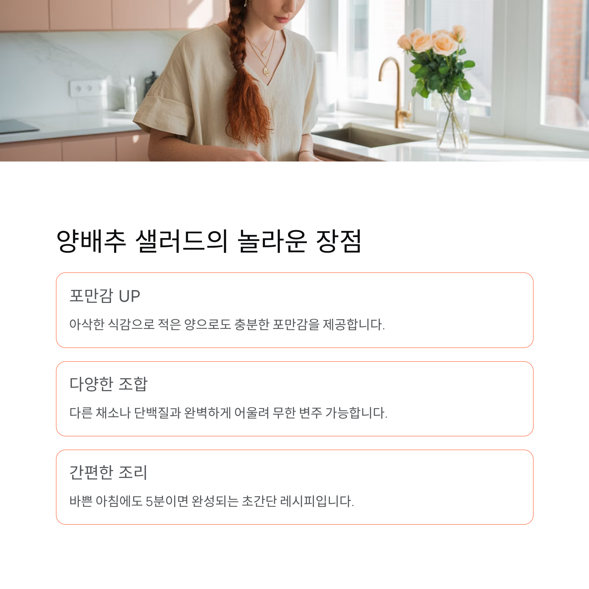 양배추는 담백하면서도 부담 없는 채소로, 샐러드로 활용하면 식감이 살아 있어 포만감을 주는 장점이 있습니다.