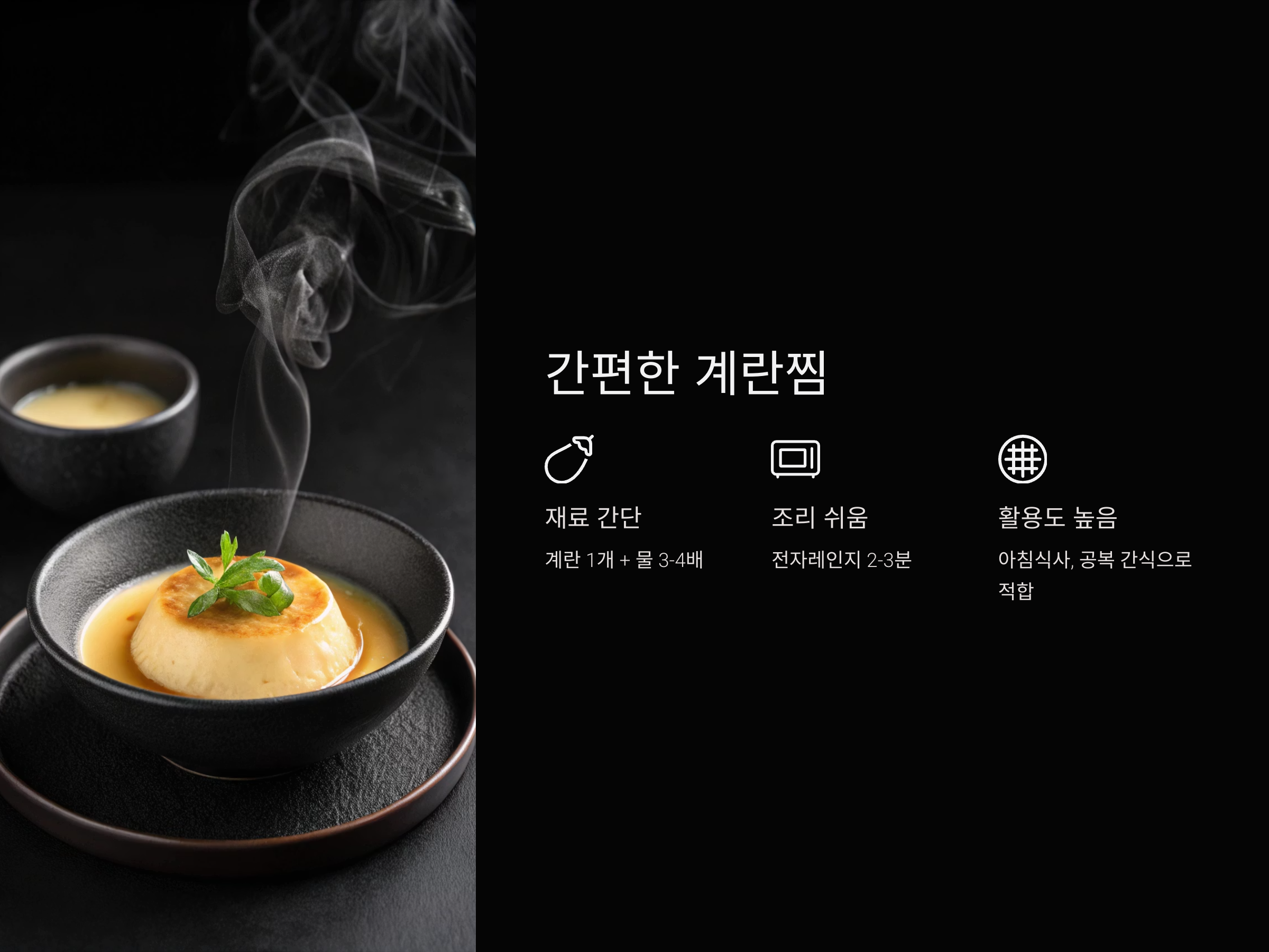 | 아침 한 끼용 | 계란찜, 스크램블 | 조리 간편, 칼로리 낮음 |