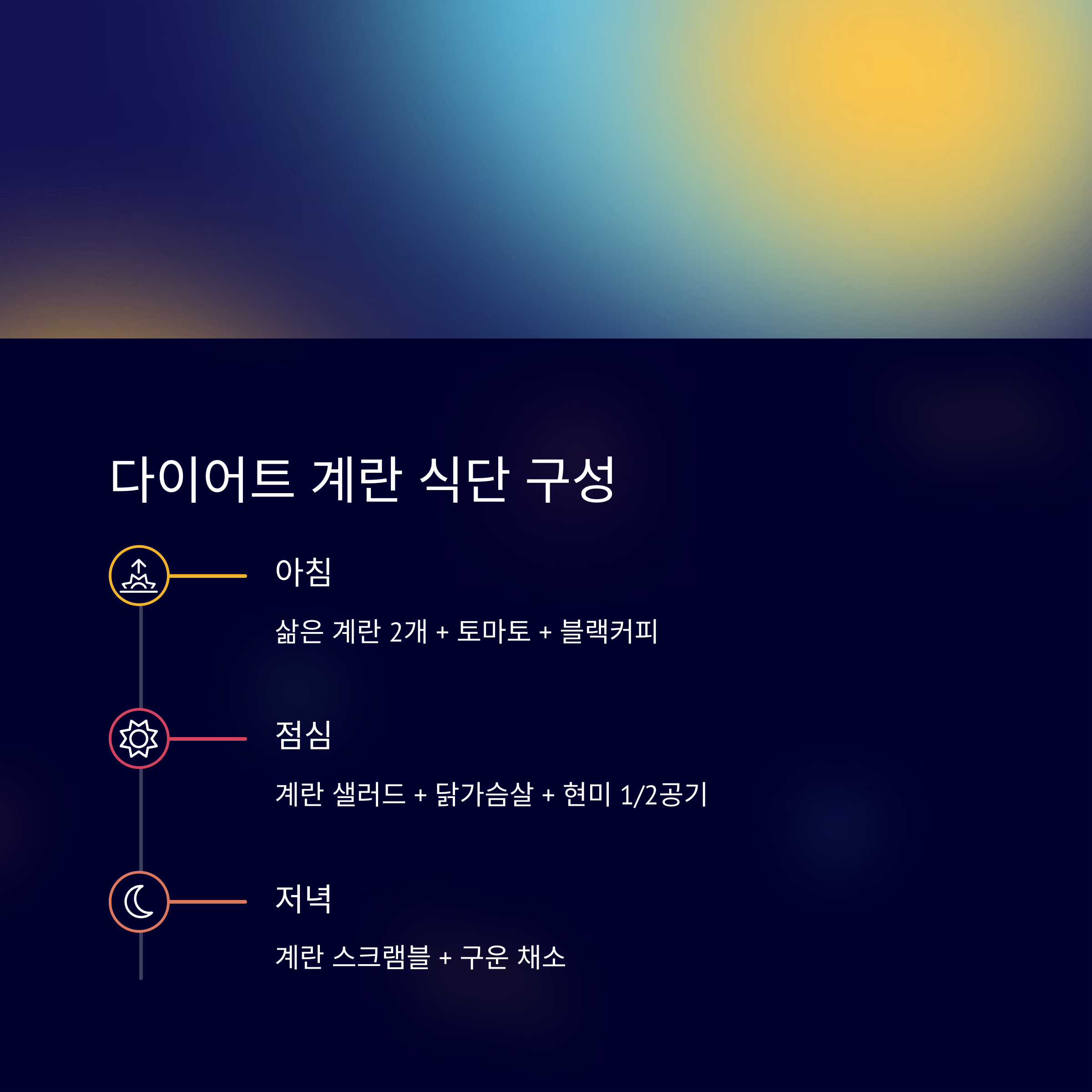 | 아침 | 삶은 계란 2개 + 토마토 + 블랙커피 |