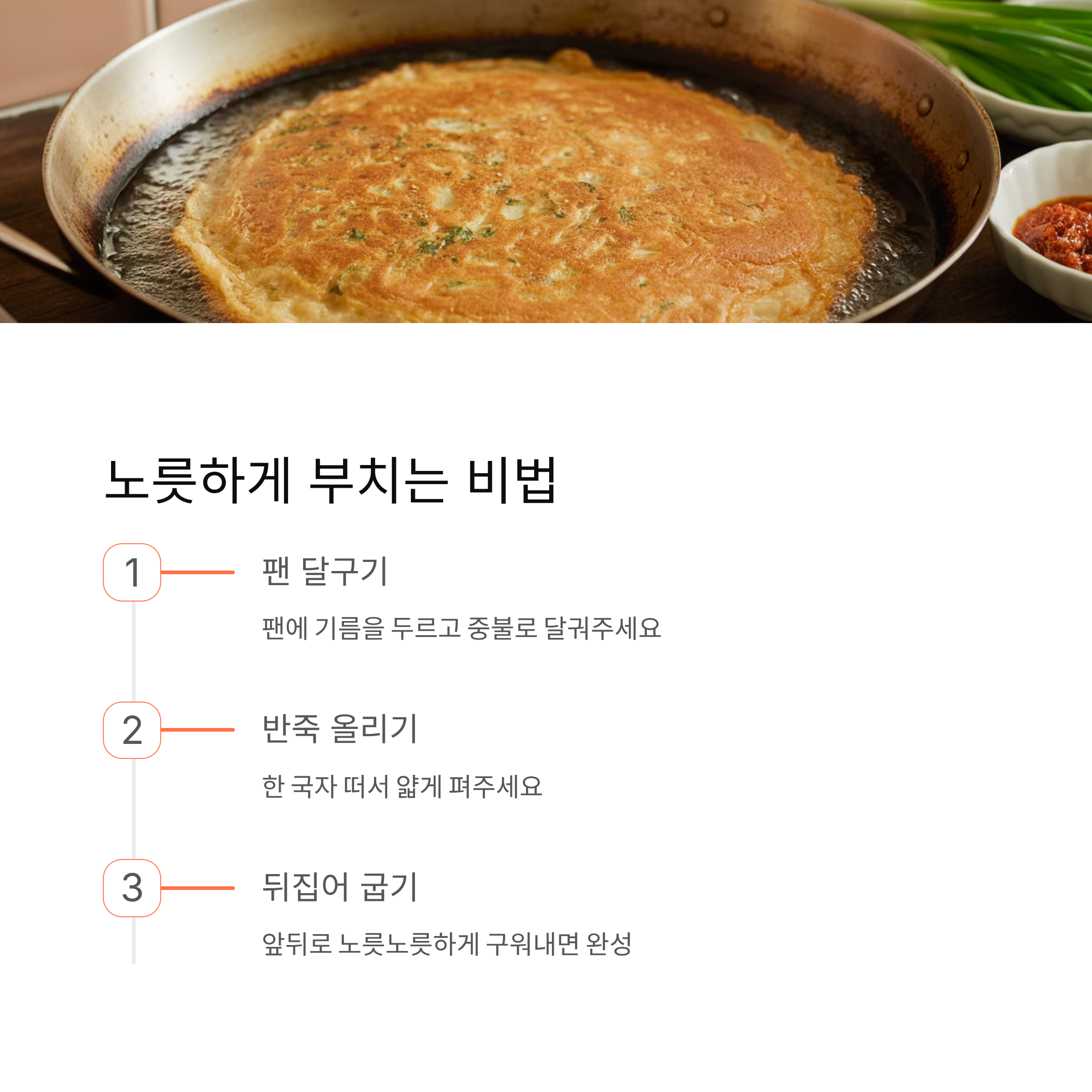 | 부치기 | 팬에 기름 두르고 중불에서 익히기 | 앞뒤 노릇하게 |