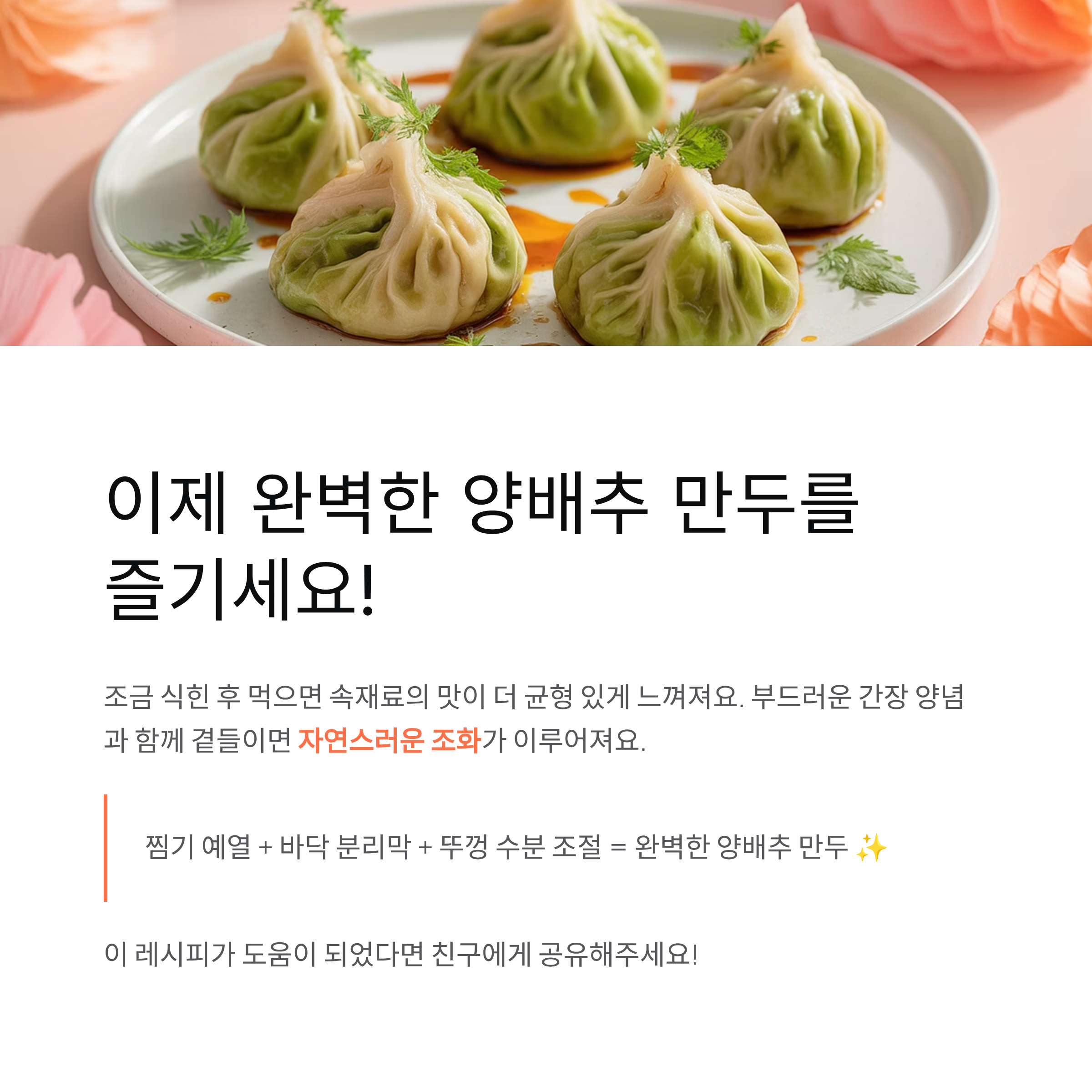 양배추 만두는 재료 자체가 가벼워서 찌는 과정에서 수분 조절이 가장 중요해요. 찜기 예열, 바닥 분리막, 뚜껑 수분 조절 이 세 가지 흐름만 지켜도 촉촉하고 부드러운 양배추 만두를 손쉽게 완성할 수 있어요. 바쁜 날에도 부담 없이 즐길 수 있는 담백한 메뉴로 추천하고 싶어요.