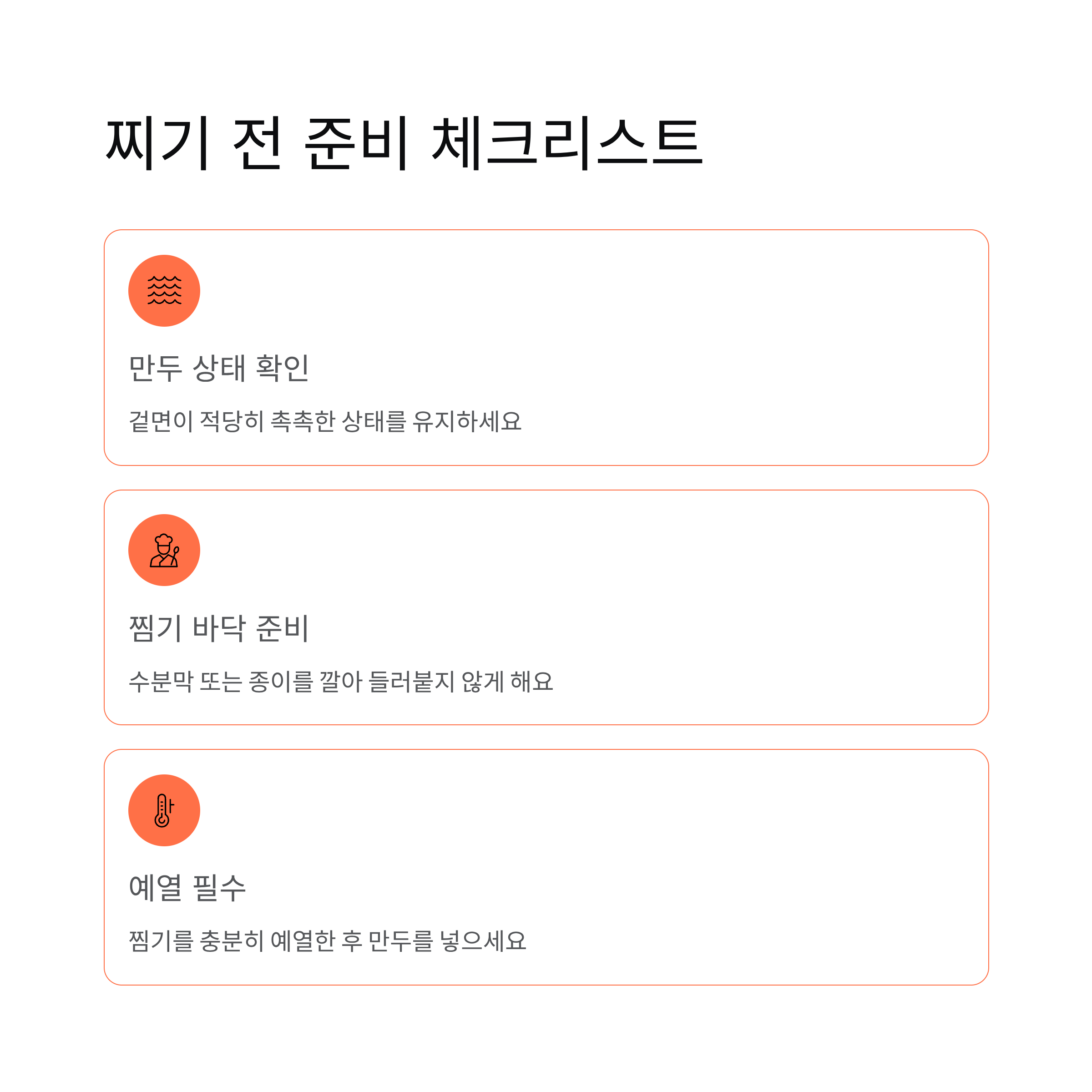 찜기 바닥에 젖은 면포나 종이를 깔아두면 만두가 붙지 않고 촉촉하게 익어요. 뜨거운 김이 만두 속까지 자연스럽게 들어갈 수 있도록 살짝 간격을 두고 올리는 것도 중요해요. 만두끼리 너무 붙어 있으면 익는 동안 서로 달라붙을 수 있으니 여유를 주는 것이 좋아요.