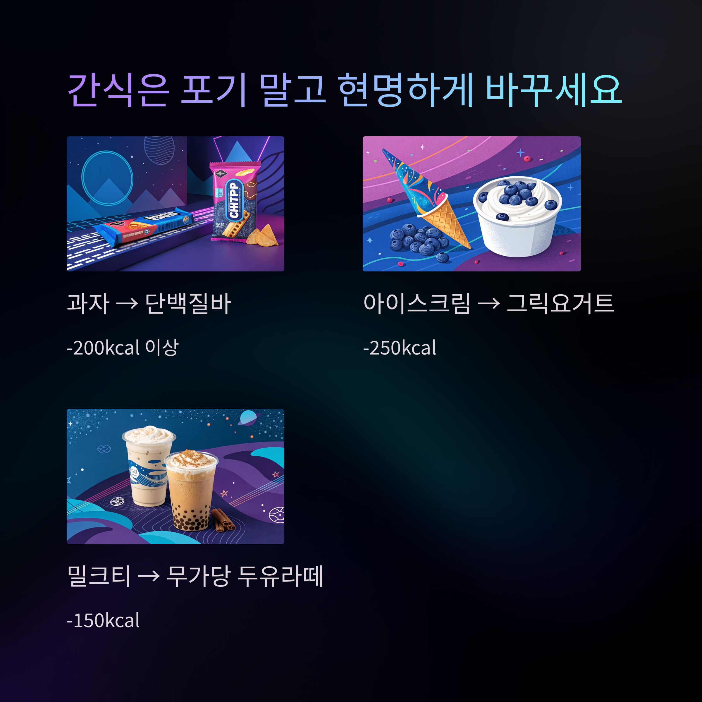| 과자 한 봉 | 곤약젤리, 단백질바 | -200kcal 이상 |