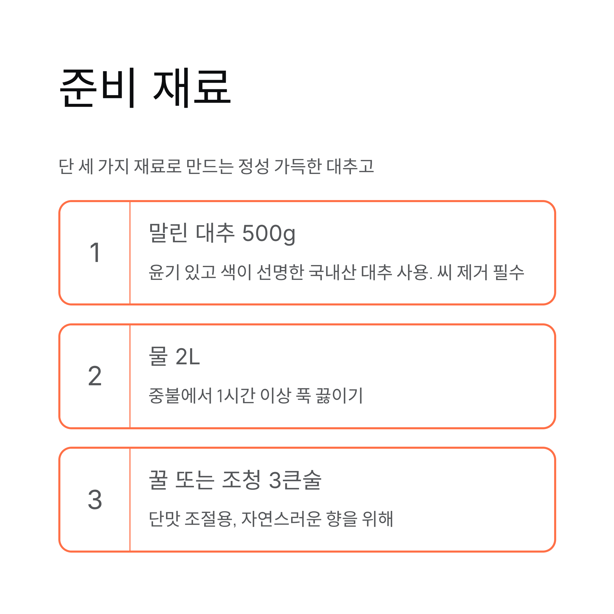 대추고의 재료는 단순하지만, 좋은 재료일수록 맛이 깊고 향이 은은합니다. 가능한 한 윤기 있고 색이 선명한 국내산 대추를 사용하는 게 좋습니다.